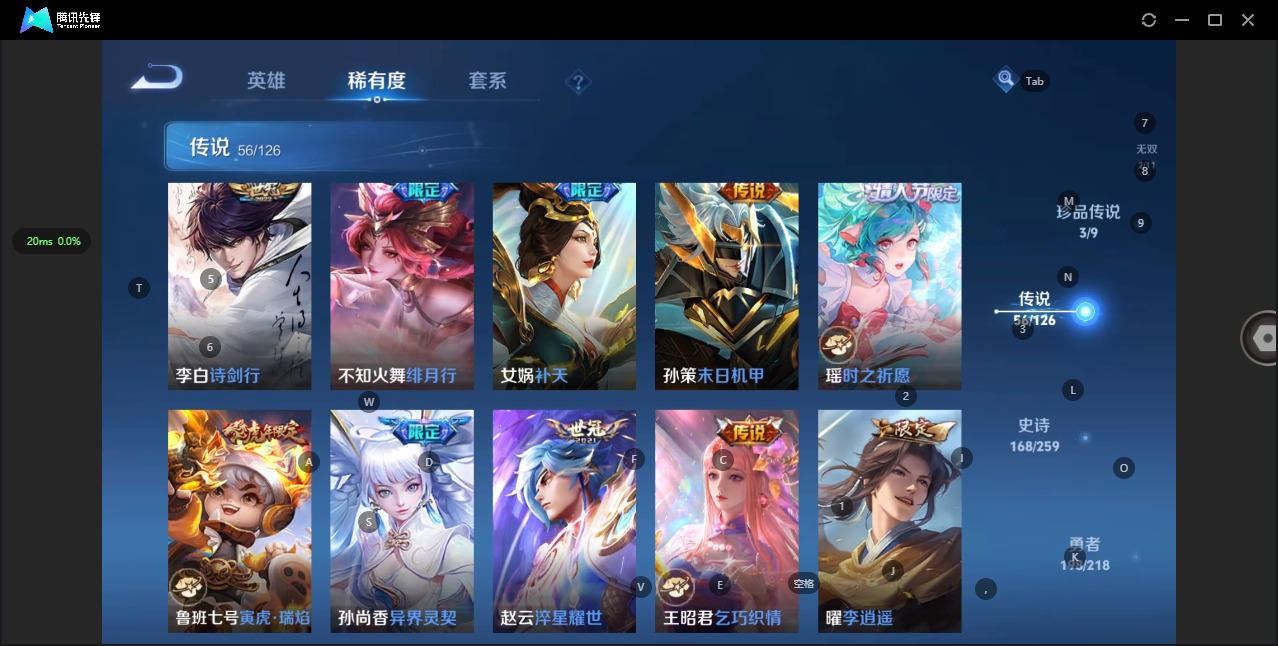 - PX_2104943-Q/至尊星耀/239皮肤/124英雄/2典藏/0珍品无双/0无双/2珍品传说/17传说/71史诗/8稀有英雄 【2 珍品传说】怪盗基德 马可波罗,时之奇旅 孙策, 【2 典藏皮肤】全息碎影 孙悟空,弑枪猎影 韩信, 【17 传说皮肤】启明星使 虞姬,李逍遥 曜,齐天大圣 孙悟空,燃星之曲 花木兰,鹤羽星尊 诸葛亮,时雨天司 诸葛亮,黄金射手座 后羿,时之奇旅 鲁班七号,时之