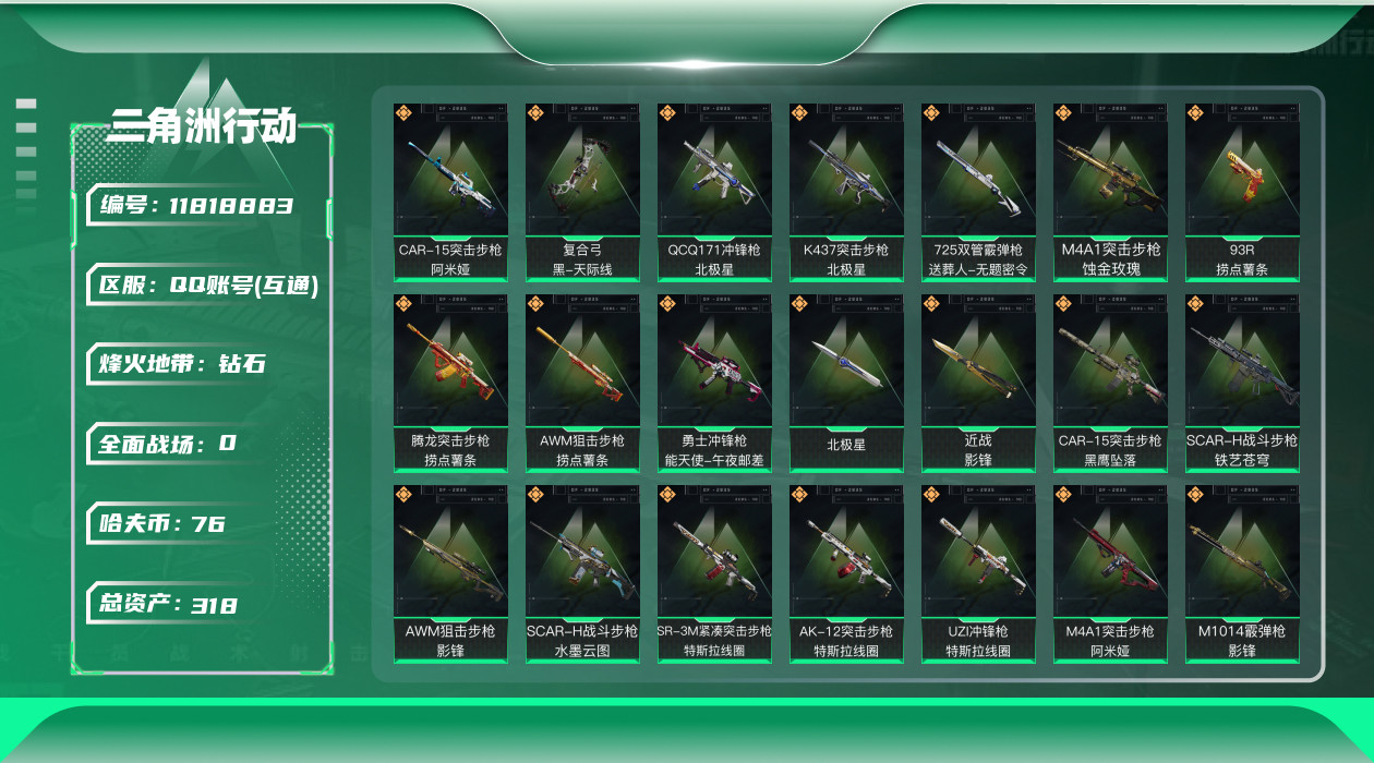 [11818883]总资产:318.9M 6干员外观 2近战传说 23传说枪械 哈夫币:76.066K 可二次 可修改实名 优质装备:近战-影锋,近战-北极星,顶级安全箱(3x3) 烽火地带段位:钻石 全面战场段位:上等兵 传说武器皮肤:SCAR-H战斗步枪-水墨云图,M1014霰弹枪-影锋,AWM狙击步枪-影锋,SCAR-H战斗步枪-铁艺苍穹,SMG45冲锋枪-骑士,UZI冲锋枪-特斯拉线圈,AWM狙击步枪-捞点薯条,腾龙突击步枪-捞点薯条,93R-捞点薯条,AK-12突击步枪-特斯拉线圈,SR-3M紧凑突击步枪-特斯拉线圈,勇士冲锋枪-能天使-午夜邮差,复合弓-黑-天际线,K437突击步枪-北极星,QCQ171冲锋枪-北极星,725双管霰弹枪-送葬人-无题密令,M4A1突击步枪-阿米娅,CAR-15突击步枪-阿米娅,AK-12突击步枪-夜鹰,M4A1突击步枪-蚀金玫瑰,CAR-15突击步枪-黑鹰坠落 史诗武器皮肤:PSG-1射手步枪-原型机(典藏),QBZ95-1突击步枪-ACE,AUG突击步枪-特勤执行,M4A1突击步枪-特勤执行,Vector冲锋枪-红色彗星,PTR-32战斗步枪-ACE,SKS射手步枪-ACE,AUG突击步枪-蝮蛇,M700狙击步枪-蝮蛇,PKM通用机枪-蝮蛇,G3战斗步枪-战场英杰,M16A4突击步枪-竞赛选手,PKM通用机枪-守夜人,AS Val突击步枪-尖端治疗,M700狙击步枪-守夜人,SG552突击步枪-尖端治疗,SR-25射手步枪-尖端治疗,M1014霰弹枪-林中猎手,MP5冲锋枪-深海恐惧,勇士冲锋枪-深海恐惧,AKM突击步枪-林中猎手,.357左轮-幸运时刻,SVD狙击步枪-暗夜猎手,SV-98狙击步枪-林中猎手,PTR-32突击步枪-英雄,AS Val突击步枪-典狱官,PKM通用机枪-荒野求生,M250通用机枪-囚徒,腾龙突击步枪-无垢,MP7冲锋枪-无垢,PSG-1射手步枪-无垢,SVD狙击步枪-荒野求生,SR-3M紧凑突击步枪-荒野求生,M14射手步枪-黑鹰坠落,沙漠之鹰-曙光,Vector冲锋枪-阿萨拉文明,S12K霰弹枪-曙光,PKM通用机枪-英雄,M700狙击步枪-竞技风,AUG突击步枪-战术迷彩 干员外观:红狼-蚀金玫瑰,威龙-壮志凌云,骇爪-水墨云图,无名-夜鹰,蜂医-送葬人·无题密令(S5),露娜-黑·天际线