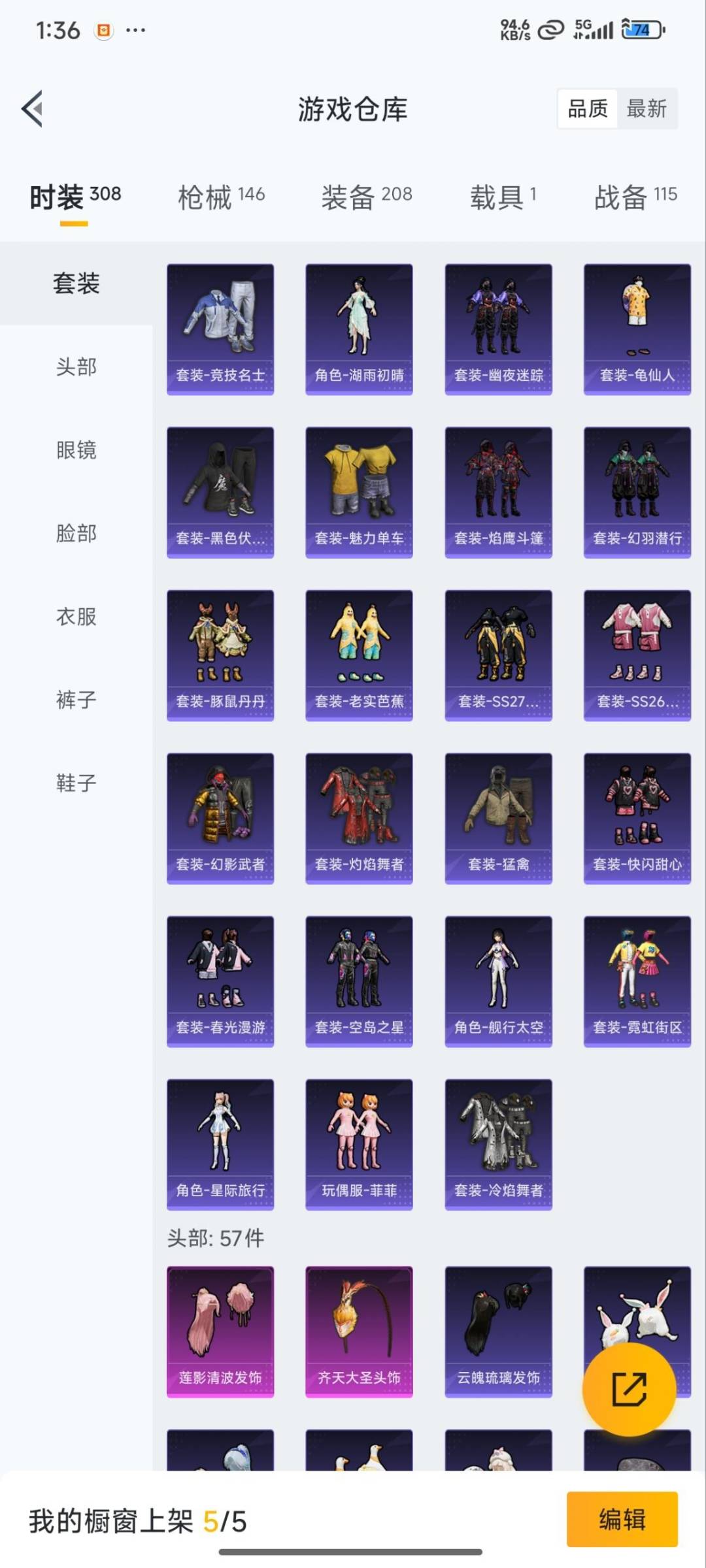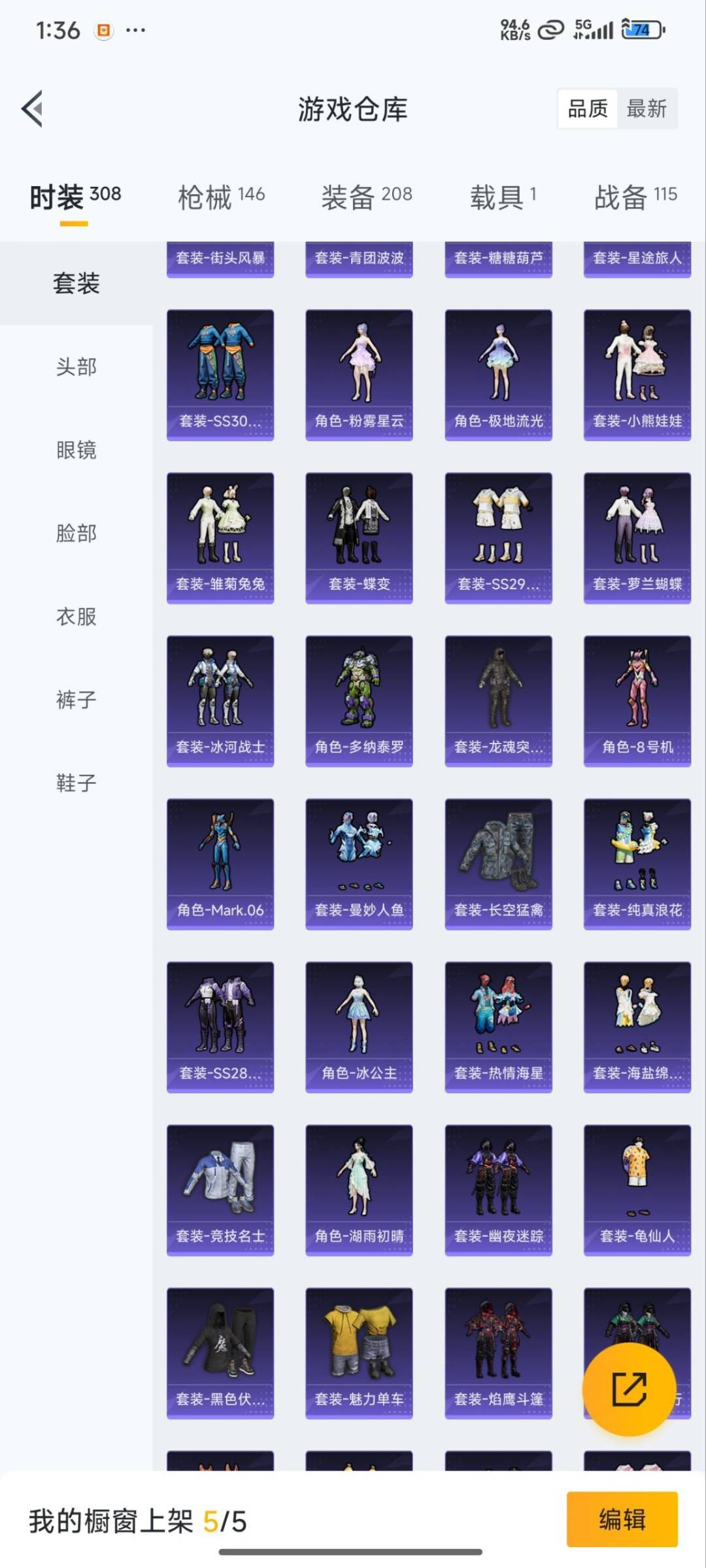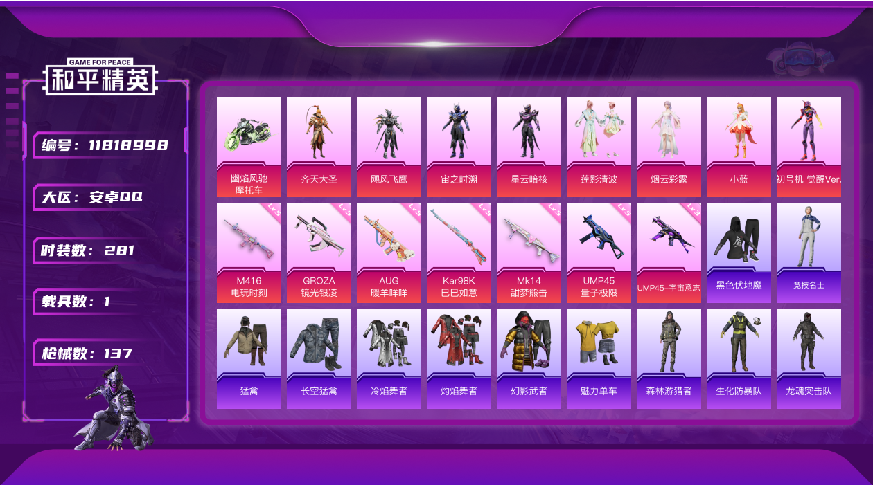 [11818998]8粉装 7特效枪 1载具 3印记 可二次 可修改实名 身法装备:初号机 觉醒Ver.(新紫螳螂),8号机(新粉螳螂),Mark.06(新蓝螳螂) 优质装备:幽焰风驰摩托车,M416电玩时刻,UMP45量子极限,UMP45-宇宙意志,GROZA-镜光银凌,AUG-暖羊咩咩,MK14-甜梦熊击,Kar98K-巳巳如意 热门装扮:飓风飞鹰,齐天大圣,宙之时溯,星云暗核,莲影清波,烟云彩露,小蓝,初号机 觉醒Ver.(新紫螳螂) 五级特效枪:五级UMP45-量子极限,五级GROZA-镜光银凌,五级Kar98K-巳巳如意,五级MK14-甜梦熊击,五级AUG-暖羊咩咩,五级M416-电玩时刻 三级特效枪:三级UMP45-宇宙意志 紫色装扮:SS31特训套装,冷焰舞者,霓虹热舞,SS30特训套装,云朵鹅,彩虹兔,雪绒豹,SS33特训套装,顶瓜瓜,时空追击者,豚鼠丹丹,长空猛禽,霓虹街区,蓝海鲸歌,魅力单车,黑色伏地魔,龟仙人,冰河战士,龙魂突击队,蝶变,幻影武者,生化防暴队,破蛋小黄鸡,空岛之星,灼焰舞者,猛禽,小熊娃娃,雏菊兔兔,萝兰蝴蝶,SS29特训,多纳泰罗,星途旅人,纯真浪花,热情海星,曼妙人鱼,SS28特训,粉雾星云,极地流光,8号机(新粉螳螂),Mark.06(新蓝螳螂),冰公主,鱼渊荷华,燕燕于飞,巳巳如意,森林游猎者,海琴烟,青团波波,糖糖葫芦,棉花软糖,竞技名士,街头风暴,许七安,湖雨初晴,星际旅行,舰行太空,菲菲,焰鹰斗篷,幻羽潜行,幽夜迷踪,SS27特训,SS26特训,春光漫游,快闪甜心,智谋强哥,大橘大利,蓝冰羽,紫幽梦,SS32特训服(SS32特训套装),暗夜风云,纯白跃动,蓝调潮影,恋语绒绒,光之冒险 优质战备:星梦奇缘降落伞,圣堂之誓降落伞,绮梦流光降落伞,精灵梦叶罗丽降落伞,星梦奇缘飞行器,初号机 觉醒Ver.降落伞,拳皇·狂花道降落伞,精灵之光降落伞,曦光华影飞行器,星途旅人降落伞,深渊漩涡飞行器,忍者神龟降落伞,巴啦啦小魔仙降落伞,江南烟雨降落伞,萌物绒绒降落伞,橘柚倾心降落伞,夜幕颂歌飞行器,千金淑猫降落伞,繁龙极客飞行器,镜域双华降落伞,镜域双华-灵镜之阶,蜜语绒猫降落伞,动力核心飞行器,千面幻镜降落伞,飞行翼-星夜魔法师