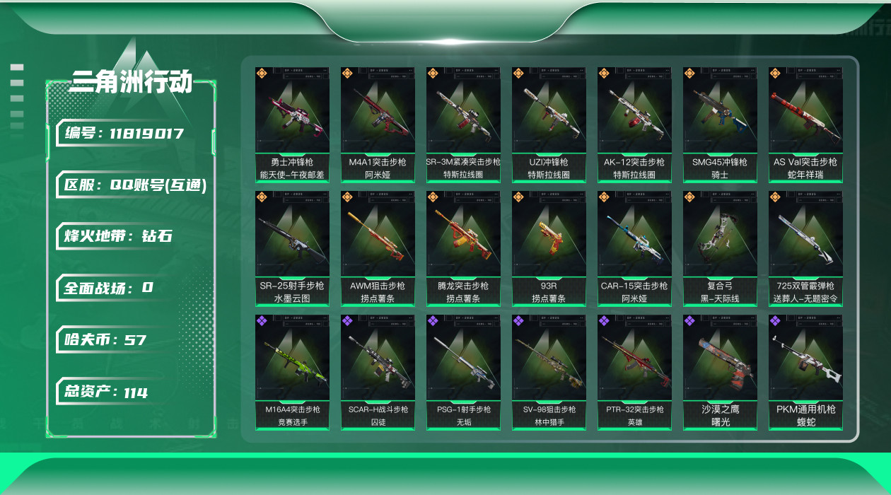 [11819017]总资产:114.6M 14传说枪械 哈夫币:57.952K 高级安全箱(2×3)9.15号到期 可二次 可修改实名 烽火地带段位:钻石 全面战场段位:上等兵 传说武器皮肤:SR-25射手步枪-水墨云图,AS Val突击步枪-蛇年祥瑞,SMG45冲锋枪-骑士,UZI冲锋枪-特斯拉线圈,AWM狙击步枪-捞点薯条,腾龙突击步枪-捞点薯条,93R-捞点薯条,AK-12突击步枪-特斯拉线圈,SR-3M紧凑突击步枪-特斯拉线圈,勇士冲锋枪-能天使-午夜邮差,复合弓-黑-天际线,725双管霰弹枪-送葬人-无题密令,M4A1突击步枪-阿米娅,CAR-15突击步枪-阿米娅 史诗武器皮肤:PKM通用机枪-蝮蛇,M16A4突击步枪-竞赛选手,M1014霰弹枪-林中猎手,MP5冲锋枪-深海恐惧,勇士冲锋枪-深海恐惧,AKM突击步枪-林中猎手,SV-98狙击步枪-林中猎手,PTR-32突击步枪-英雄,PKM通用机枪-荒野求生,M250通用机枪-囚徒,SV-98狙击步枪-囚徒,SCAR-H战斗步枪-囚徒,腾龙突击步枪-无垢,MP7冲锋枪-无垢,PSG-1射手步枪-无垢,SVD狙击步枪-荒野求生,SR-3M紧凑突击步枪-荒野求生,沙漠之鹰-曙光