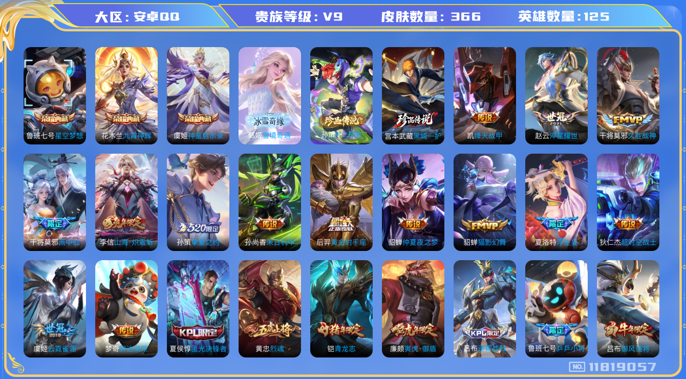[11819057]V9 3典藏 1无双 2珍品传说 22传说 125英雄 366皮肤 可修改实名 优质装备:星空梦想(太空人),九霄神辉(木兰典藏),神鉴启示录,雪境奇遇-甄姬,黑崎一护,黄金射手座,绛天战甲(鸡嘴战神),猫影幻舞,久胜战神,云霓雀翎,末日机甲-孙尚香(绿蚂蚱),仲夏夜之梦(大飞蛾),胖达荣荣,淬星耀世,超时空战士-狄仁杰,挚爱之约,山海·炽霜斩(李信年限),画中仙,浮生妄 珍品传说:时之奇旅-孙策 珍宝阁皮:蔷薇恋人,女武神 限定皮:愿照·岁时盈(虞姬年限),愿照·众生和(妲己年限),逐霄战戟,鸣野蒿,至尊宝,前尘镜,时雨天司(水龙头),飞衡(韩信年限),诗剑行,匿光决锋者,五谷丰年,青龙志(铠年限),御风骁将(吕布年限),烈魂,祈雪灵祝(雪兔子),李小龙,逐梦之影,大圣娶亲,乒乒小将,寅虎·御盾(廉颇年限),玉兔公主,山海·玄木吟(马可年限) 史诗皮:鸭鸭历险记-刘禅,器灵·浮梦炉,星界战将,谪仙醉月,龙之律动,布丁狗之誓,小牛鸭,石田雨龙,百相守梦-周瑜,戍鼓铭心,茶境仙,怒海争锋,撼地雄心,破空之剑,战舞者,蒙犽顽岩魄,蔬乡物语(鲁班七号),百相守梦-百里守约,星界特工,紫霞仙子,电玩小子(小书包),白龙吟,黄金分割率,特工魅影,千年之狐,永昼,江河有灵,魅语,百解令(蒙犽),高渐离燃音魔法,蒙恬荣光圣徽,无限星赏官,偶像歌手,晚萤,电玩·爆裂旋风,暗夜猫娘,龙骑士(小龙虾),末日机甲-吕布,猫狗日记-孙策,猫狗日记-大乔,时之恋人-孙尚香,乱世虎臣,节奏热浪,修罗,女仆咖啡,摇滚巨星,水果甜心,绅士熊喵,天才门将,星夜王子,心灵骇客,功夫厨神,德古拉伯爵,暗隐猎兽者,幽灵船长,鬼剑武藏,心灵战警,乐园奇幻夜,舞动绿茵,地狱岩魂,纤云弄巧,拒霜思,缤纷独角兽,乘风破浪,逐浪之夏,月团寄思,水晶猎龙者,箭羽风息,金属风暴,原初追逐者,圣诞狂欢,圣诞恋歌,鹰眼统帅,暗夜贵公子,魅力维加斯,寅虎·御盾,无心