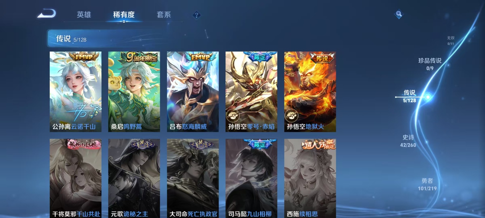 - [11627290]V7 5传说 108英雄 127皮肤 可修改实名 优质装备:地狱火,淬星耀世,超时空战士-狄仁杰,牧神诗旅 限定皮:鸣野蒿,飞衡(韩信年限),冰锋战神,御风骁将(吕布年限),烈魂,逐梦之光,辉光之辰,引擎之心 史诗皮:紫霞仙子,白龙吟,黄金分割率,特工魅影,千年之狐,冰冠公主,修罗,水果甜心,天才门将,德古拉伯爵,暗隐猎兽者,幽灵船长,地狱岩魂,缤纷独角兽,乘风破浪,逐浪之夏,曙光守护者,圣诞恋歌,鹰眼统帅