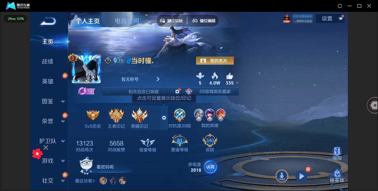 - PX_2094781-贵族等级: V5 英雄数: 94 皮肤数: 50 传说皮: 霜月吟,澜逐花归海