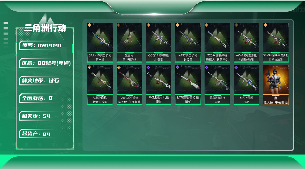 [11819191]总资产:84.6 1干员外观 9传说枪械 高级安全箱(2×3)9.15号到期 可二次 可修改实名 烽火地带段位:钻石 全面战场段位:上等兵 哈夫币:54.203 传说武器皮肤:CAR-15突击步枪-阿米娅,复合弓-黑-天际线,QCQ171冲锋枪-北极星,AK-12突击步枪-特斯拉线圈,SR-3M紧凑突击步枪-特斯拉线圈,UZI冲锋枪-特斯拉线圈,725双管霰弹枪-送葬人-无题密令,K437突击步枪-北极星,Vector冲锋枪-能天使-午夜邮差 史诗武器皮肤:M700狙击步枪-蝮蛇,PKM通用机枪-蝮蛇,腾龙突击步枪-无垢,MP7冲锋枪-无垢 干员外观:蛊-能天使·午夜邮差