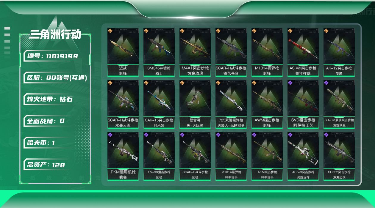 [11819199]总资产:128.5M 3干员外观 1近战传说 12传说枪械 哈夫币:1.527K 顶级安全箱(3×3)9.15号到期 可二次 可修改实名 优质装备:近战-影锋,顶级安全箱(3x3) 烽火地带段位:钻石 全面战场段位:尉官 传说武器皮肤:AS Val突击步枪-蛇年祥瑞,SCAR-H战斗步枪-水墨云图,M1014霰弹枪-影锋,AWM狙击步枪-影锋,SCAR-H战斗步枪-铁艺苍穹,AK-12突击步枪-夜鹰,SMG45冲锋枪-骑士,CAR-15突击步枪-阿米娅,复合弓-黑-天际线,725双管霰弹枪-送葬人-无题密令,M4A1突击步枪-蚀金玫瑰 史诗武器皮肤:QBZ95-1突击步枪-ACE,M4A1突击步枪-特勤执行,AUG突击步枪-特勤执行,Vector冲锋枪-红色彗星,PTR-32战斗步枪-ACE,SKS射手步枪-ACE,M700狙击步枪-蝮蛇,PKM通用机枪-蝮蛇,SR-25射手步枪-战场英杰,SR-25射手步枪-尖端治疗,AS Val突击步枪-尖端治疗,SG552突击步枪-尖端治疗,Ash-12战斗步枪-守夜人,SR-3M紧凑突击步枪-荒野求生,SG552突击步枪-深海恐惧,AKM突击步枪-林中猎手,M16A4突击步枪-竞赛选手,PKM通用机枪-守夜人,SVD狙击步枪-荒野求生,P90冲锋枪-暗影猎手,M1014霰弹枪-林中猎手,SV-98狙击步枪-林中猎手,PTR-32突击步枪-英雄,SV-98狙击步枪-囚徒,SCAR-H战斗步枪-囚徒,腾龙突击步枪-无垢,MP7冲锋枪-无垢,Vector冲锋枪-阿萨拉文明,SVD狙击步枪-阿萨拉工艺,S12K霰弹枪-曙光,PKM通用机枪-英雄 干员外观:红狼-蚀金玫瑰,骇爪-水墨云图,露娜-黑·天际线