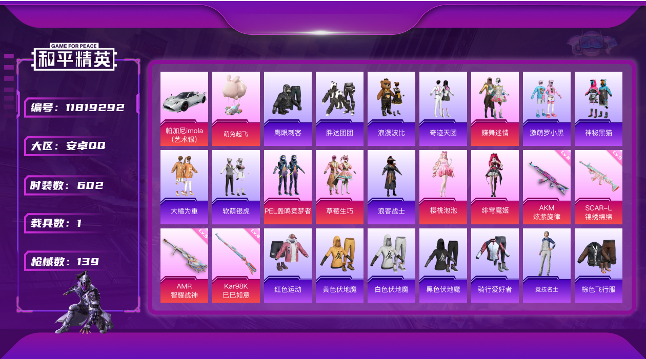 [11819292]5粉装 4特效枪 1载具 6印记 可二次 可修改实名 身法装备:暗影哥特(红眼罩),萌熊伴侣背包(粉熊背包) 优质装备:帕加尼imola(艺术银),萌熊伴侣背包(粉熊背包),AKM炫紫旋律,蝶舞迷情,PEL轰鸣竞梦者,草莓生巧,SCAR-L-锦绣绵绵,樱桃泡泡,AMR-智耀战神,绯穹魔姬,Kar98K-巳巳如意 热门装扮:神秘黑猫,软萌银虎,奇迹天团,胖达团团,浪客战士,激萌罗小黑,大橘为重,鹰眼刺客,浪漫波比 载具:僚机-萌兔起飞 六级特效枪:六级AKM-炫紫旋律 五级特效枪:五级AMR-智耀战神,五级SCAR-L-锦绣绵绵 四级特效枪:四级Kar98K-巳巳如意 紫色装扮:SS31特训套装,SS5特训,六六大吉,冰原使者,,冰川特警,冷焰舞者,凛冬战士,北国孤狼,SS33特训套装,青涩时光,顶瓜瓜,SS15特训,SS13特训,SS14特训,甜心亚梦,SS17特训,SS18特训,野性山猫,野性战心,野性战魂,金鼠迎春,长空猛禽,雨林探路者,雪山征服者,雪山精英,霓虹街区,迎春赐吉,缤纷果语,耀眼新星,蓝色守护者,血色贵族,跃动心情,风行保卫者,龙腾端午,骑行爱好者,魅力单车,黄色伏地魔,黑色伏地魔,龙的传人,龟仙人,熔岩游骑兵连帽夹克,朋克治安官,极地朋克,格斗先锋,棕色飞行服,沙漠兵团,活力之心,海滨突袭者,滨海假日,幻影武者,圣诞大吉,夏日音浪,滨海厨神,绮丽涂鸦,疯狂小兔子,白熊同盟,白色伏地魔,破晓战魂,破蛋小黄鸡,甜蜜告白,福星高照,空岛之星,竞技勇士朋克,竞技达人朋克,红色运动,甜蜜熊情侣,牛气冲天,灰色守护者,灰色格斗者,牛气满满,特战装甲,狂沙舞者,红潮炫舞,竞技名士,暗影哥特(红眼罩),惊鸿侠骨,SS25特训,锦衣飞扬,SS27特训,明鸳圣池,金羽特工,浪漫天命,SS26特训,春光漫游,快闪甜心,贝斯之夜,晶辉守护,精神漫游,炽焰拳师,格斗专家,SS6特训,黑色刀锋,核芯基因,拳皇97八神庵,SS7特训,人鱼之吻,深蓝冒险家,迷域探索者,顽皮玉兔,奇趣章鱼,星光纪元,玲珑飞花,SS8特训,乘风破浪,原初圣火,逆风勇士,SS12特训,PEL躁动竞梦者,纯白誓言,众神之王,爱神,智慧之神,SS9特训,风华少年志,SS10特训,暗夜契约,安第斯皇冠,荷鲁斯之眼,机械英豪,机械征服者,SS11特训,耀粉歌者,海洋之心,春日漫步,SS32特训服(SS32