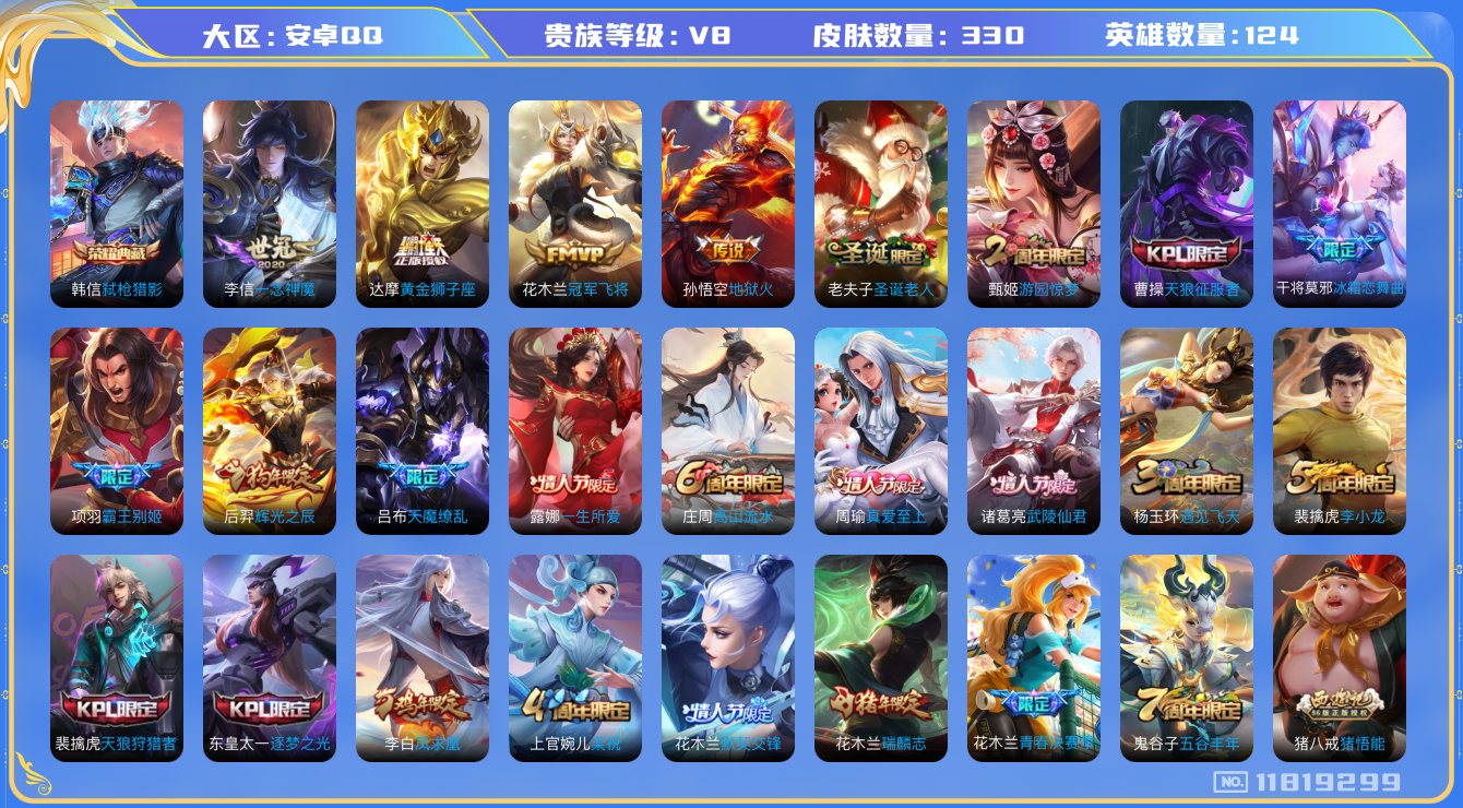 - [11297273]V8 1典藏 12传说 124英雄 280皮肤 可修改实名 优质装备:九霄神辉(木兰典藏),云鹰飞将(小将军),炽阳神光,山海·炽霜斩(李信年限),妄想奇谈,鹤归松栖(云缨),诡秘之主 传说皮:乘龙·铭钟鼎(赵云年限),幻光神枪 珍宝阁皮:蔷薇恋人,玩趣恶龙 限定皮:愿照·九州拓(澜年限),逐霄战戟,鸣野蒿,傲雪梅枪,绯月行,五谷丰年,梁祝,李小龙,如梦令-后羿,青春决赛季,神器·万象笔 史诗皮:器灵·浮梦炉,星界战将,龙之律动,海诺心动手记,破空之剑,谪仙醉月,上官婉儿群星魔术团,守夜人,百相守梦-黄忠,紫霞仙子,苍穹之光,黄金分割率,特工魅影,千年之狐,永昼,电玩·爆裂旋风,江河有灵,百解令(蒙犽),蒙恬荣光圣徽,龙骑士(小龙虾),暗夜猫娘,魅语,无限星赏官,晚萤,末日机甲-吕布,猫狗日记-孙策,乱世虎臣,节奏热浪,修罗,女仆咖啡,摇滚巨星,水果甜心,星夜王子,心灵骇客,功夫厨神,德古拉伯爵,暗隐猎兽者,幽灵船长,鬼剑武藏,心灵战警,舞动绿茵,地狱岩魂,纤云弄巧,繁星吟游(呼啦呼啦),拒霜思,缤纷独角兽,乘风破浪,逐浪之夏,月团寄思,水晶猎龙者,曙光守护者,箭羽风息,金属风暴,原初追逐者,圣诞狂欢,圣诞恋歌,鹰眼统帅,魅力维加斯,赏金猎手,无心,未来纪元-赵云