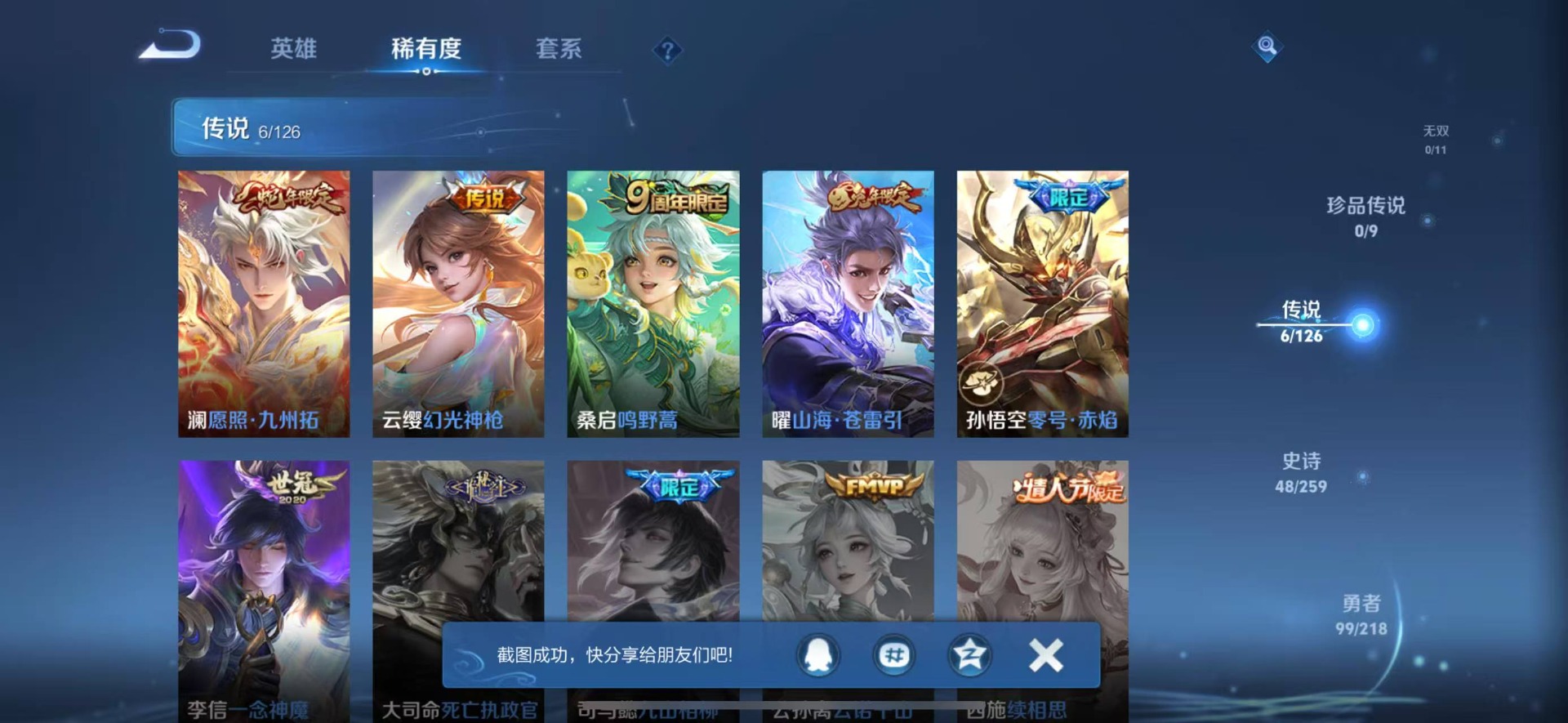 - PX_2091417-实名: 可修改 贵族等级: V7 英雄数: 105 皮肤数: 86 传说皮: 炽阳神光,游龙清影,琥珀纪元铠,乘龙·铭钟鼎,典韦战鼓燎原,幻光神枪 限定皮: 至尊宝,五谷丰年,齐天大圣,逐霄战戟,愿照·岁时盈,愿照·九州拓