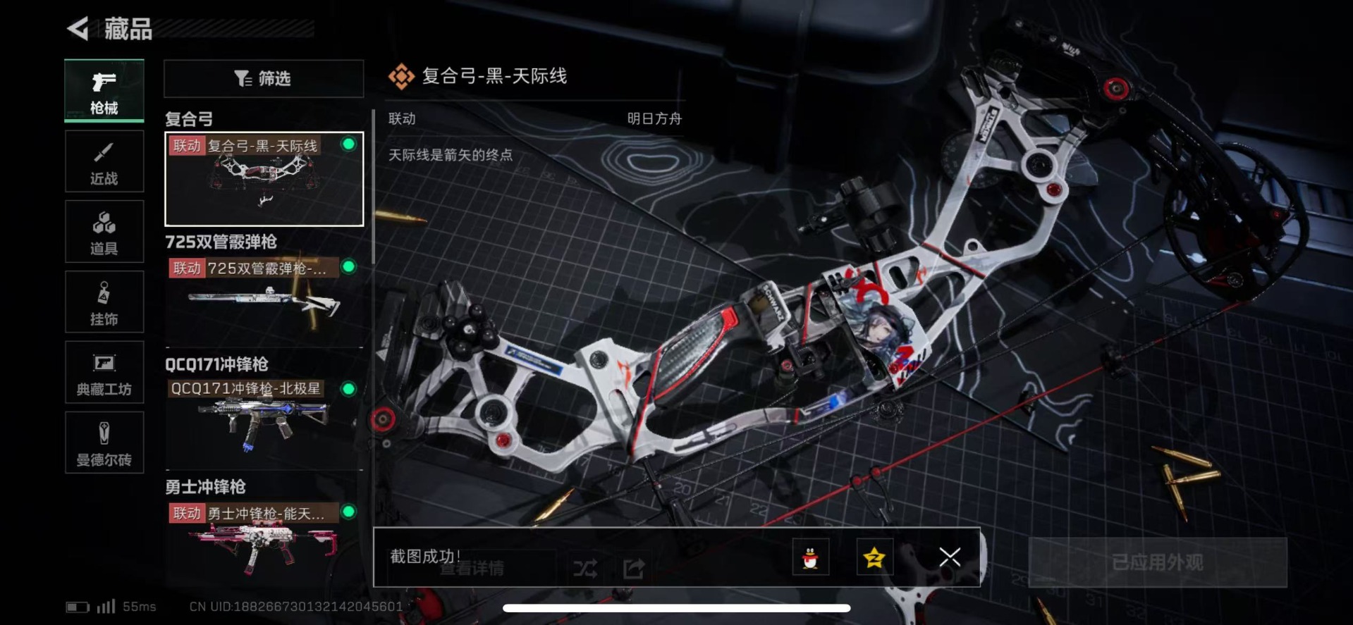 - [11295949]总资产:111.2 1传说枪械 进阶安全箱(2×2)9.15号到期 可二次 可修改实名 烽火地带段位:钻石 全面战场段位:无段位 哈夫币:50.868 传说武器皮肤:复合弓-黑-天际线