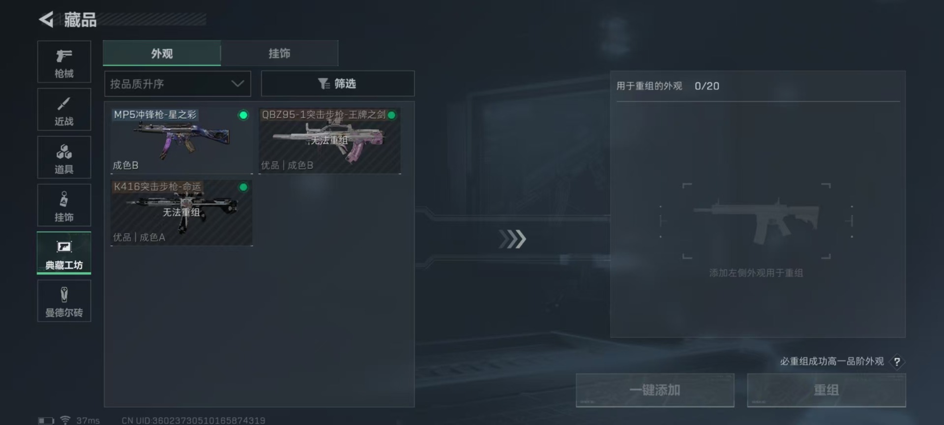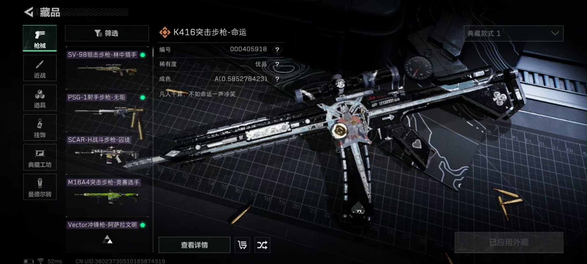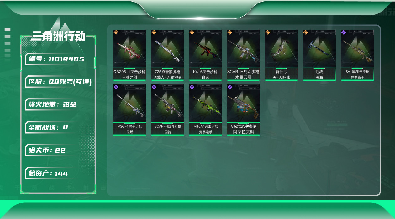 [11819405]总资产:144.8 1近战传说 6传说枪械 高级安全箱(9.17到期) 可二次 可修改实名 优质装备:近战-黑海,K416突击步枪-命运(典藏),QBZ95-1突击步枪-王牌之剑(典藏) 烽火地带段位:铂金 全面战场段位:上等兵 哈夫币:22.844 传说武器皮肤:SCAR-H战斗步枪-水墨云图,复合弓-黑-天际线,725双管霰弹枪-送葬人-无题密令 史诗武器皮肤:M16A4突击步枪-竞赛选手,SV-98狙击步枪-林中猎手,PSG-1射手步枪-无垢,SCAR-H战斗步枪-囚徒,Vector冲锋枪-阿萨拉文明