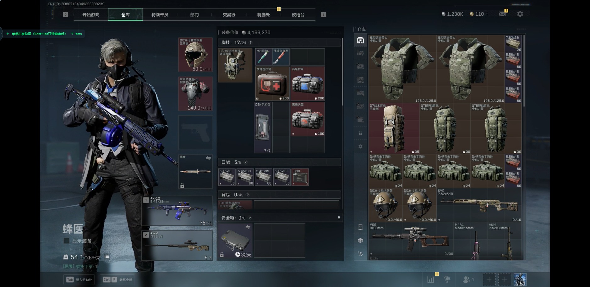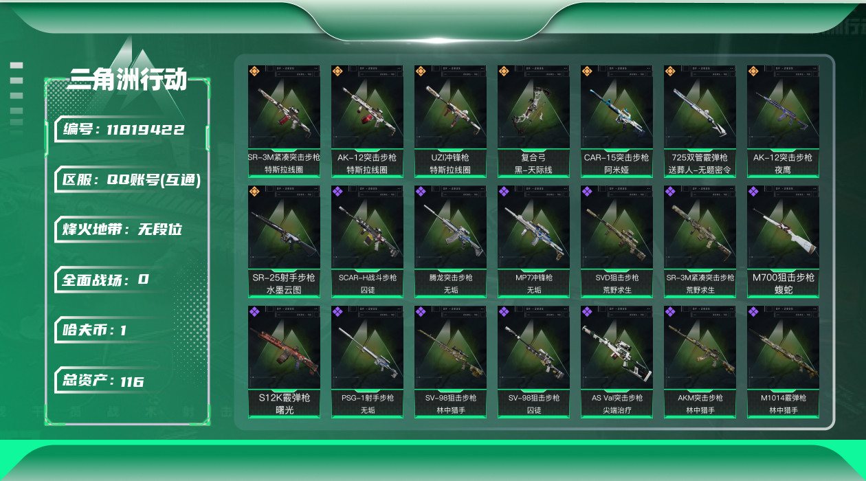 [11819422]总资产:116.2M 8传说枪械 哈夫币:1.238K 高级安全箱(9.17到期) 可二次 可修改实名 烽火地带段位:无段位 全面战场段位:无段位 传说武器皮肤:SR-25射手步枪-水墨云图,AK-12突击步枪-夜鹰,CAR-15突击步枪-阿米娅,复合弓-黑-天际线,AK-12突击步枪-特斯拉线圈,SR-3M紧凑突击步枪-特斯拉线圈,UZI冲锋枪-特斯拉线圈,725双管霰弹枪-送葬人-无题密令 史诗武器皮肤:SR-3M紧凑突击步枪-英雄,M700狙击步枪-蝮蛇,PKM通用机枪-蝮蛇,AS Val突击步枪-尖端治疗,SR-3M紧凑突击步枪-荒野求生,AKM突击步枪-林中猎手,PKM通用机枪-守夜人,SVD狙击步枪-荒野求生,M1014霰弹枪-林中猎手,SV-98狙击步枪-林中猎手,PSG-1射手步枪-无垢,SV-98狙击步枪-囚徒,SCAR-H战斗步枪-囚徒,腾龙突击步枪-无垢,MP7冲锋枪-无垢,S12K霰弹枪-曙光