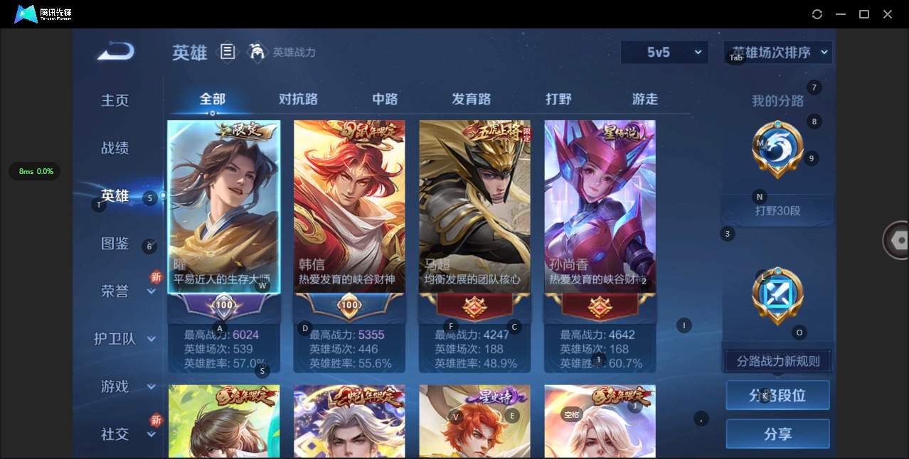 - [11772771]V5 4传说 108英雄 92皮肤 可修改实名 优质装备:超时空战士-狄仁杰,涂山容容 传说皮:幻光神枪 珍宝阁皮:优雅恋人 限定皮:愿照·九州拓(澜年限),鸣野蒿,山海·玄木吟(马可年限) 史诗皮:鸭鸭历险记-刘禅,苍鳞隐世,器灵·浮梦炉,星界战将,龙之律动,布丁狗之誓,石田雨龙,茶境仙,百相守梦-黄忠,特工魅影,蒙恬荣光圣徽,偶像歌手,末日机甲-吕布,猫狗日记-孙策,水果甜心,星夜王子,心灵骇客,功夫厨神,德古拉伯爵,鬼剑武藏,暗渊魔法,乐园奇幻夜,天秀·启明,乘风破浪,逐浪之夏,圣诞狂欢,鹰眼统帅,魅力维加斯,未来纪元-赵云