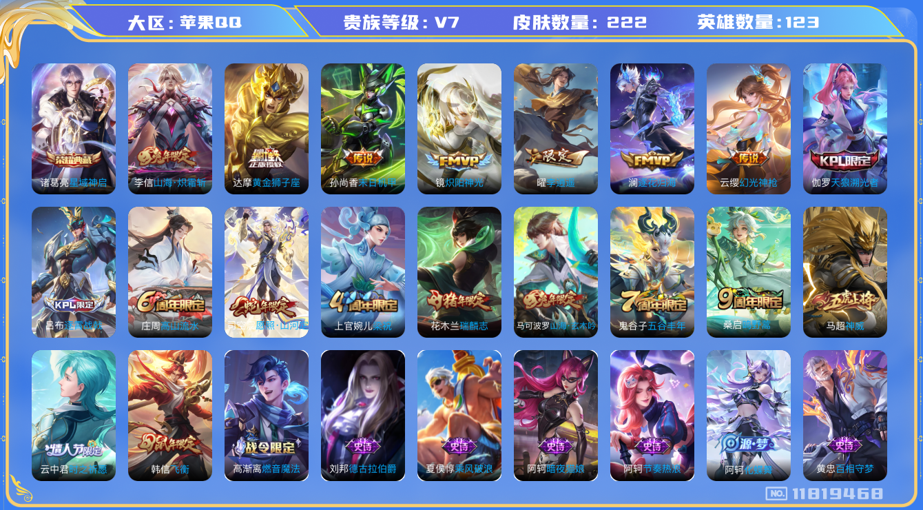 [11819468]V7 1典藏 9传说 123英雄 222皮肤 可修改实名 优质装备:星域神启(倪克斯贼亮),黄金狮子座,炽阳神光,末日机甲-孙尚香(绿蚂蚱),李逍遥,山海·炽霜斩(李信年限),澜逐花归海 传说皮:幻光神枪 珍宝阁皮:妄想食味,胡桃夹子 限定皮:愿照·山河定(司空震年限),逐霄战戟,鸣野蒿,神威(电光马子),飞衡(韩信年限),瑞麟志(木兰年限),高山流水,五谷丰年,梁祝,天狼溯光者,时之祈愿-云中君,山海·玄木吟(马可年限) 史诗皮:化蝶舞,茶境仙,百相守梦-百里守约,百相守梦-黄忠,紫霞仙子,电玩小子(小书包),白龙吟,黄金分割率,千年之狐,电玩·爆裂旋风,百解令(蒙犽),高渐离燃音魔法,蒙恬荣光圣徽,偶像歌手,暗夜猫娘,晚萤,猫狗日记-孙策,节奏热浪,修罗,女仆咖啡,水果甜心,星夜王子,德古拉伯爵,暗隐猎兽者,幽灵船长,鬼剑武藏,心灵战警,天秀·启明,舞动绿茵,纤云弄巧,缤纷独角兽,乘风破浪,逐浪之夏,曙光守护者,箭羽风息,圣诞恋歌,鹰眼统帅,魅力维加斯,黎明之约,无心,未来纪元-赵云,玫瑰异探