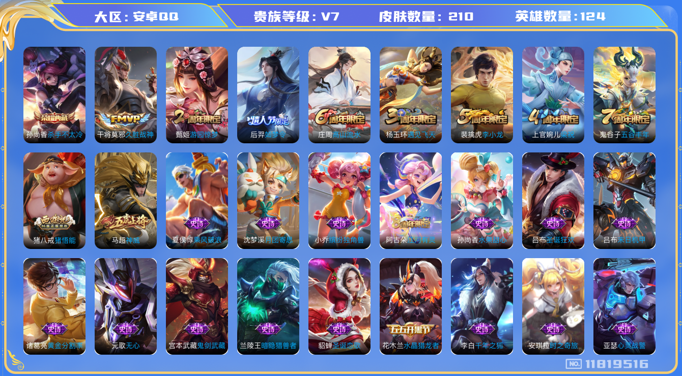 - [12208567]【特价急出/详情看图】:安卓Q-V7-至尊星耀III段位-124英雄-247皮肤-2典藏-5传说-63史诗 【荣耀典藏】:孙悟空全息碎影,韩信弑枪猎影 【传说皮肤】:司空震愿照山河定,澜愿照九州拓,桑启鸣野蒿,典韦战鼓燎原,孙尚香末日机甲 【限定皮肤】:白起狰,蔡文姬夏日便利店,虞姬夏日便利店,姜子牙天穹之誓,狄仁杰阴阳师,虞姬凯尔特女王,赵云皇家上将,孙尚香蔷薇恋人,鲁班七号狮舞东方,阿轲迷踪丽影,孙膑妖精王,芈月重明,夏侯惇朔风刀,曹操烛龙,典韦穷奇,典韦蓝屏警告,马可波罗暗影游猎,狄仁杰魔术师,狄仁杰万华元夜,项羽海滩派对,老夫子醍醐杖,关羽冰锋战神,程咬金演武夺筹,刘邦夺宝奇兵,孙悟空至尊宝,孙悟空大圣娶亲,牛魔御旌,李元芳银河之约,李元芳云中旅人,钟馗神迹守卫,钟馗驱傩正仪,女娲朔望之晖,蔡文姬繁星吟游,太乙真人饕餮,鬼谷子原初探秘者,鬼谷子五谷丰年,黄忠烈魂,百里玄策原初追逐者,弈星混沌棋,沈梦溪星空之诺,沈梦溪大漠名商,明世隐疑决卦,裴擒虎擒涛扼浪,狂铁御狮,米莱狄御霄,盾山御銮,猪八戒西部大镖客,上官婉儿梁祝,鲁班大师探海日志,桑启海盐诗旅,沈梦溪龙舞盛年 【年限皮肤】:黄忠烈魂 【赛季限定】:孙膑妖精王,白起狰,芈月重明,夏侯惇朔风刀,曹操烛龙,典韦穷奇,狄仁杰万华元夜,老夫子醍醐杖,程咬金演武夺筹,牛魔御旌,李元芳云中旅人,虞姬凯尔特女王,钟馗驱傩正仪,太乙真人饕餮,鬼谷子原初探秘者,百里玄策原初追逐者,弈星混沌棋,沈梦溪大漠名商,明世隐疑决卦,裴擒虎擒涛扼浪,狂铁御狮,米莱狄御霄,盾山御銮,鲁班大师探海日志,桑启海盐诗旅,姜子牙天穹之誓 【战令限定】:蔡文姬夏日便利店,虞姬夏日便利店,鲁班七号狮舞东方,阿轲迷踪丽影,典韦蓝屏警告,马可波罗暗影游猎,刘邦夺宝奇兵,李元芳银河之约,钟馗神迹守卫,女娲朔望之晖,沈梦溪星空之诺,猪八戒西部大镖客 【史诗皮肤】:露娜紫霞仙子,赵云皇家上将,赵云未来纪元,貂蝉圣诞恋歌,甄姬冰雪圆舞曲,王昭君偶像歌手,狄仁杰魔术师,廉颇地狱岩魂,宫本武藏鬼剑武藏,孙尚香蔷薇恋人,孙尚香水果甜心,嬴政摇滚巨星,妲己女仆咖啡,墨子金属风暴,曹操幽灵船长,李白千年之狐,吕布末日机甲,张飞乱世虎臣,关羽冰锋战神,孙悟空至尊宝,花木兰水晶猎龙者,夏侯惇乘风破浪,兰陵王暗隐猎兽者,诸葛亮黄金分割率,雅典娜冰冠公主,百里守约特工魅影,铠