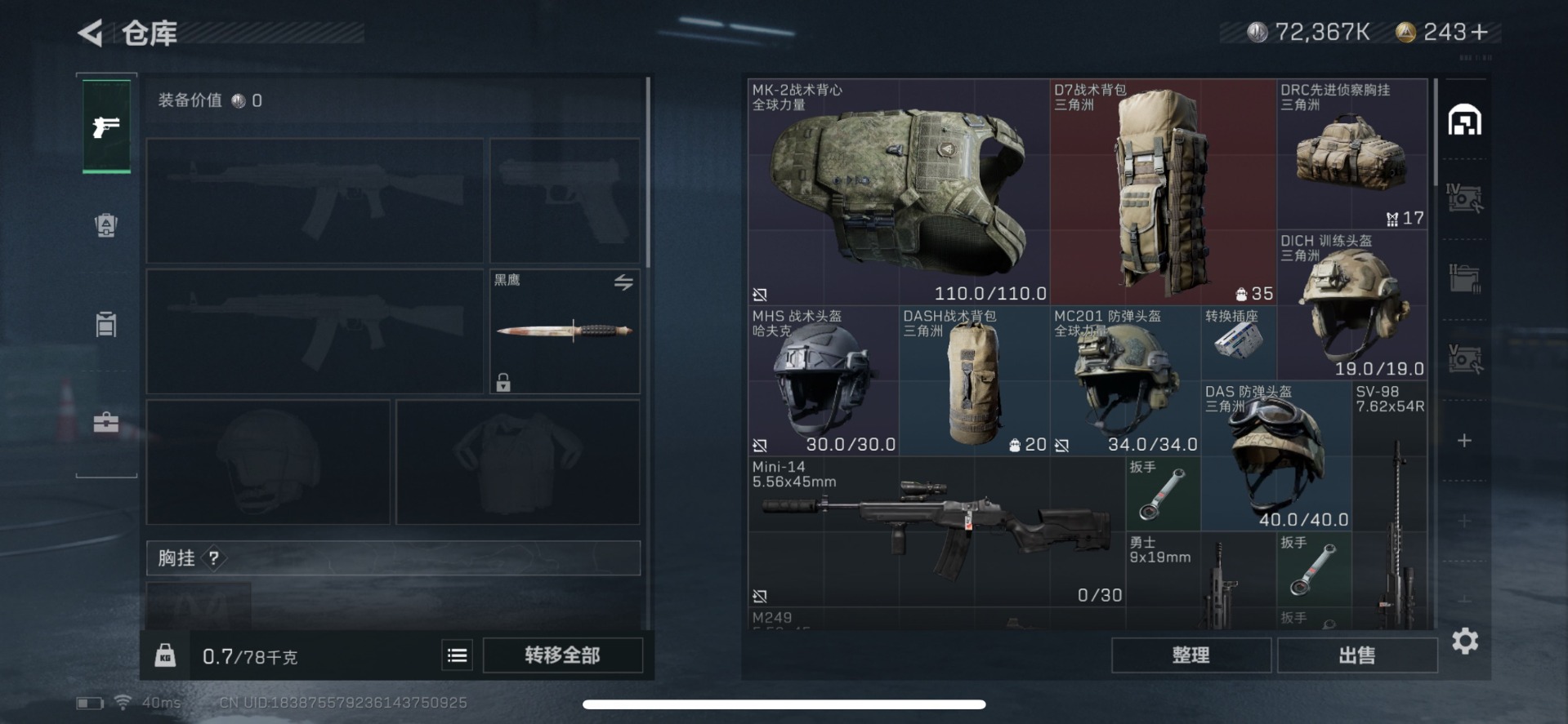 [11819528]总资产:105.3 1干员外观 1传说枪械 进阶安全箱(2×2)9.15号到期 可二次 可修改实名 烽火地带段位:青铜 全面战场段位:列兵 哈夫币:72.367 传说武器皮肤:复合弓-黑-天际线 干员外观:红狼-蚀金玫瑰