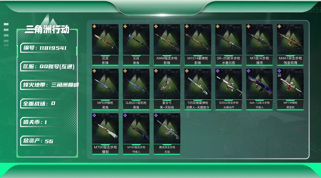 [11819541]总资产:56.8 2近战传说 11传说枪械 高级安全箱(2×3)9.15号到期 可二次 可修改实名 烽火地带段位:三角洲巅峰 全面战场段位:上等兵 哈夫币:1.132 传说武器皮肤:近战-影锋,近战-黑海,SR-25射手步枪-水墨云图,AWM狙击步枪-影锋,M1014霰弹枪-影锋,QJB201轻机枪-黑海,MP5冲锋枪-黑海,复合弓-黑-天际线,725双管霰弹枪-送葬人-无题密令,M7战斗步枪-维京,M4A1突击步枪-蚀金玫瑰 史诗武器皮肤:MP7冲锋枪-原型机(典藏),M700狙击步枪-蝮蛇,M700狙击步枪-守夜人,SG552突击步枪-尖端治疗,Ash-12战斗步枪-守夜人,腾龙突击步枪-无垢