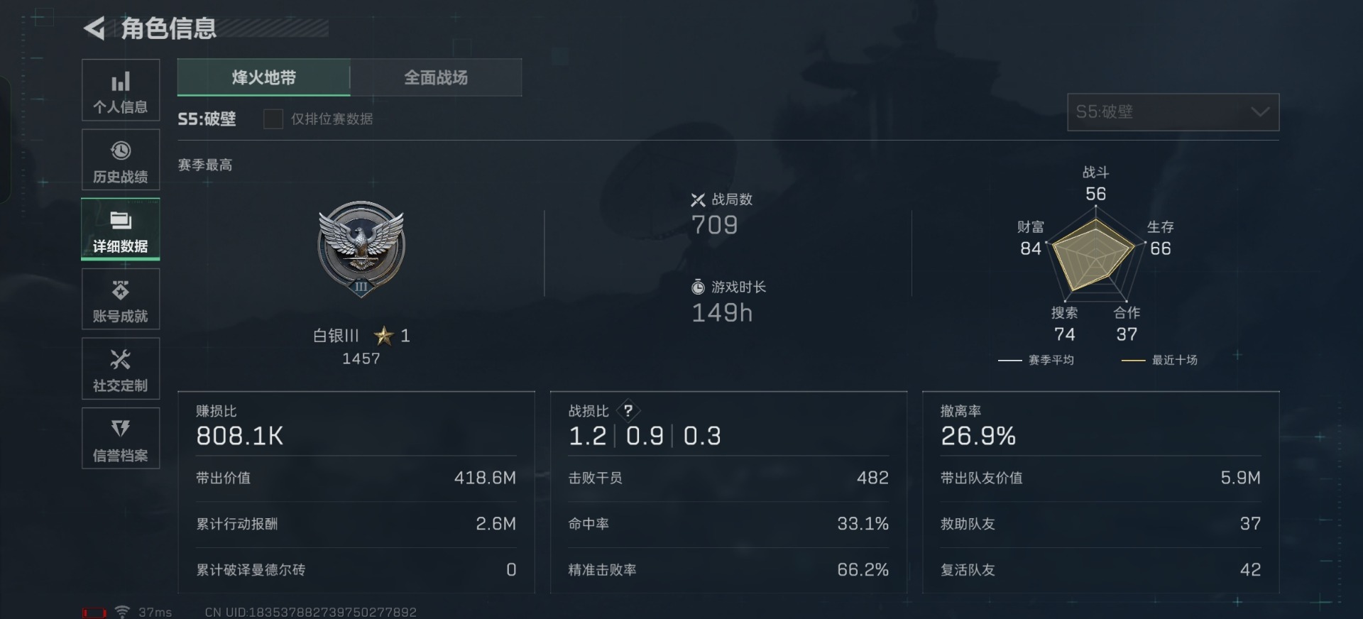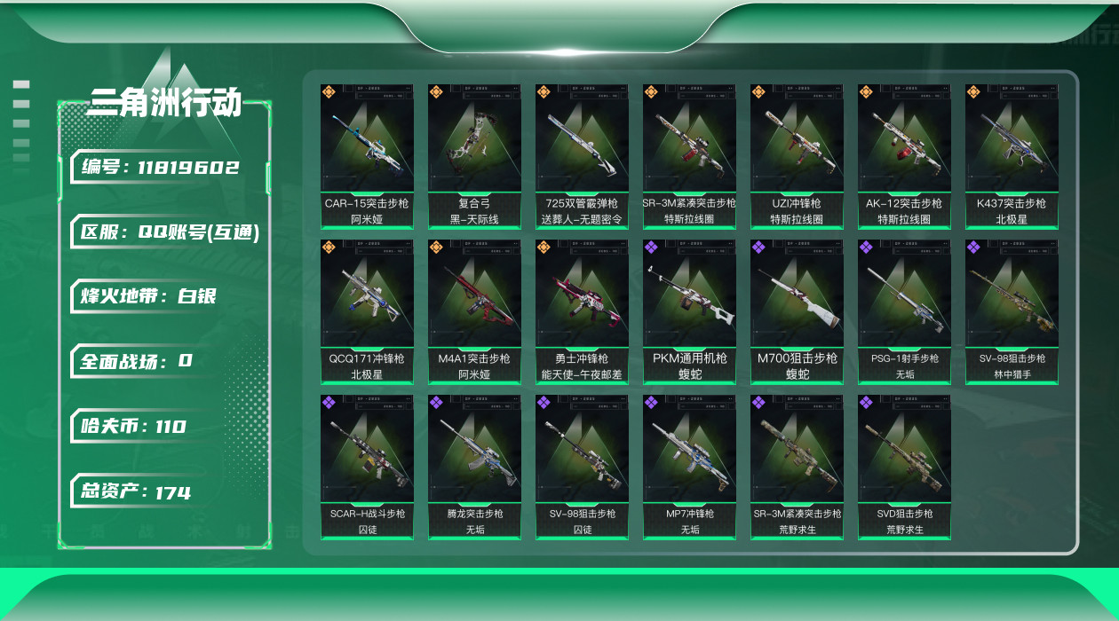 [11819602]总资产:174.5M 10传说枪械 哈夫币:110K 高级安全箱(2×3)9.15号到期 可二次 可修改实名 烽火地带段位:白银 全面战场段位:列兵 传说武器皮肤:M4A1突击步枪-阿米娅,CAR-15突击步枪-阿米娅,复合弓-黑-天际线,QCQ171冲锋枪-北极星,AK-12突击步枪-特斯拉线圈,SR-3M紧凑突击步枪-特斯拉线圈,UZI冲锋枪-特斯拉线圈,勇士冲锋枪-能天使-午夜邮差,725双管霰弹枪-送葬人-无题密令,K437突击步枪-北极星 史诗武器皮肤:M700狙击步枪-蝮蛇,PKM通用机枪-蝮蛇,SR-3M紧凑突击步枪-荒野求生,SV-98狙击步枪-林中猎手,SVD狙击步枪-荒野求生,SV-98狙击步枪-囚徒,SCAR-H战斗步枪-囚徒,腾龙突击步枪-无垢,MP7冲锋枪-无垢,PSG-1射手步枪-无垢