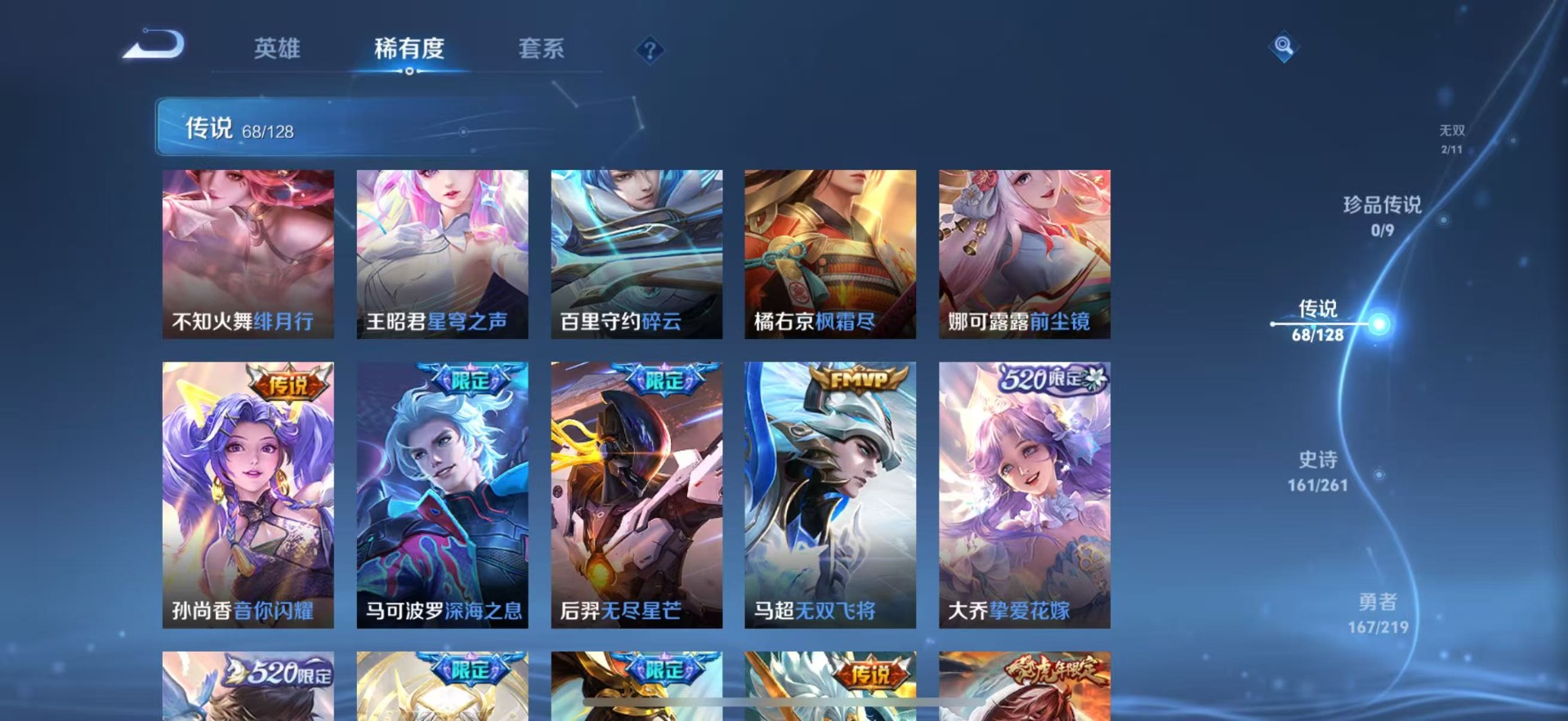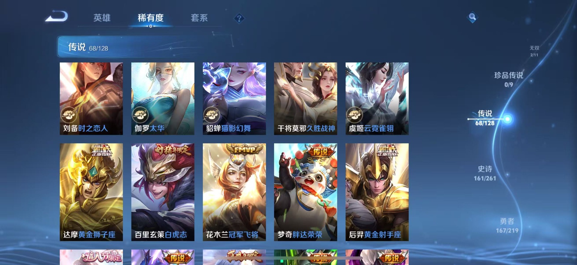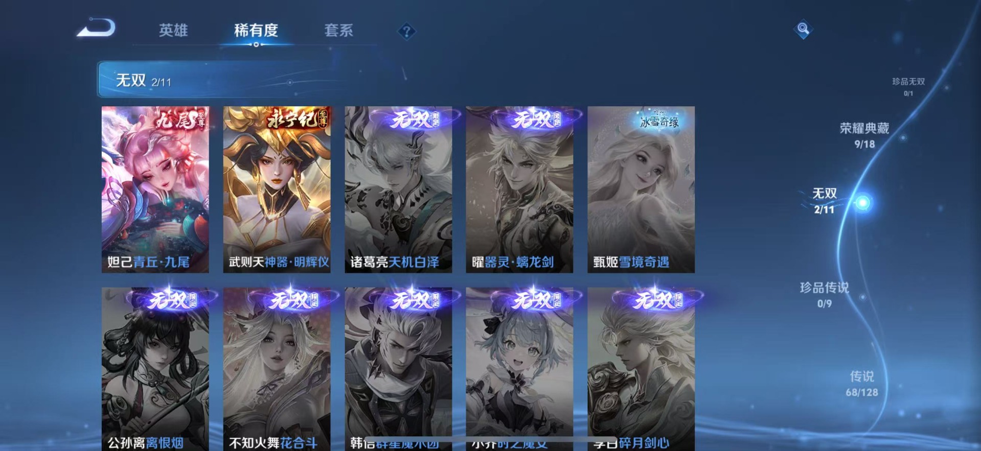 金蝉唐三藏,夏侯惇匿光决锋者,黄忠烈魂,老夫子圣诞老人,盾山梦圆繁星,铠青龙志,伽罗太华,苏烈玄武志,张飞虎魄,孙膑天狼运算者,典韦岱宗,孙尚香异界灵契,不知火舞绯月行,项羽霸王别姬,后羿无尽星芒,后羿如梦令,露娜启示之音,周瑜真爱至上,诸葛亮时雨天司,兰陵王默契交锋,公孙离玉兔公主,公孙离蜜橘之夏,裴擒虎梅西,貂蝉逐梦之音,鲁班大师匿光启智者,裴擒虎李小龙,裴擒虎天狼狩猎者,裴擒虎寅虎·赤拳,上官婉儿梁祝,上官婉儿神器·万象笔,上官婉儿天狼绘梦者,李白诗剑行,马可波罗山海·玄木吟,马可波罗深海之息,猪八戒猪悟能,女娲补天,孙悟空孙行者,孙悟空至尊宝,百里玄策白虎志,马超神威,雅典娜神奇女侠,赵云引擎之心,盘古冰霜神祇,云中君时之祈愿,妲己时之奇旅,韩信傲雪梅枪,韩信飞衡,韩信逐梦之影,百里守约朱雀志,墨子降魔,瑶山海·碧波行,娜可露露前尘镜,妲己热情桑巴,王昭君凤凰于飞,嫦娥如梦令,王昭君星穹之声,关羽冰锋战神,橘右京枫霜尽