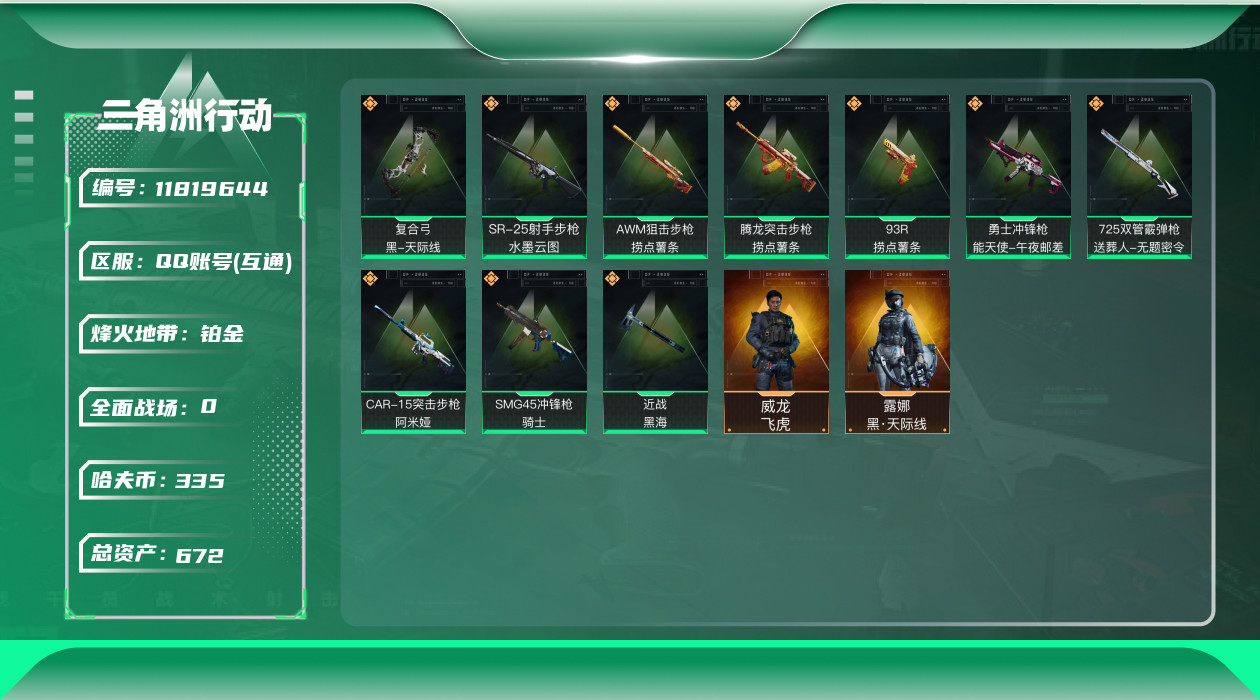 [11819644]总资产:672.3M 2干员外观 1近战传说 10传说枪械 哈夫币:335K 顶级安全箱(3×3)9.15号到期 可二次 可修改实名 优质装备:近战-黑海,顶级安全箱(3x3) 烽火地带段位:铂金 全面战场段位:上等兵 传说武器皮肤:SR-25射手步枪-水墨云图,SMG45冲锋枪-骑士,CAR-15突击步枪-阿米娅,复合弓-黑-天际线,AWM狙击步枪-捞点薯条,腾龙突击步枪-捞点薯条,93R-捞点薯条,勇士冲锋枪-能天使-午夜邮差,725双管霰弹枪-送葬人-无题密令 干员外观:威龙-飞虎,露娜-黑·天际线