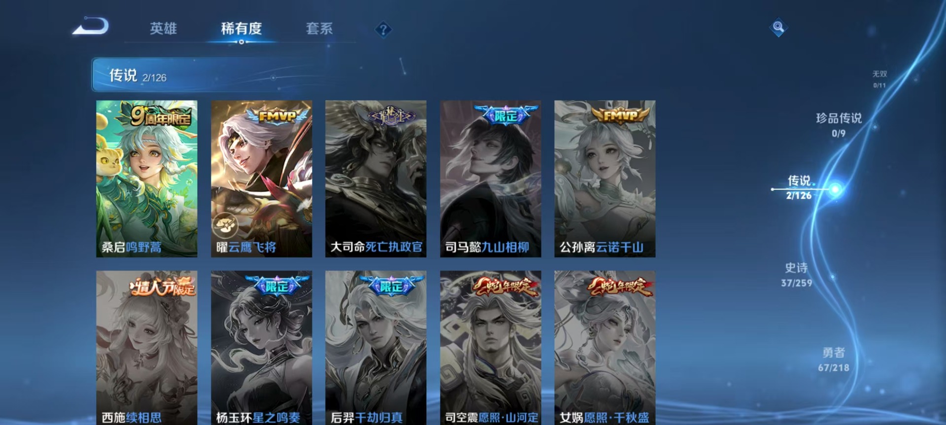 - [11523169]V7 11传说 123英雄 200皮肤 可修改实名 优质装备:猫影幻舞,一念神魔,地狱火,零号·赤焰,超时空战士-狄仁杰,音你闪耀(rap皮),碎云,神器·狴犴令 传说皮:乘龙·铭钟鼎(赵云年限) 珍宝阁皮:女武神 限定皮:鸣野蒿,高山流水,齐天大圣,五谷丰年,冰锋战神,游园惊梦,梁祝,天狼溯光者,李小龙,孙行者,大圣娶亲,乒乒小将,神器·万象笔 史诗皮:破空之剑,遇见神鹿,苍穹之光,电玩小子(小书包),黄金分割率,特工魅影,千年之狐,江河有灵,高渐离燃音魔法,晚萤,冰冠公主,猫狗日记-孙策,时之恋人-孙尚香,节奏热浪,水果甜心,绅士熊喵,功夫厨神,暗隐猎兽者,幽灵船长,鬼剑武藏,纤云弄巧,繁星吟游(呼啦呼啦),乘风破浪,逐浪之夏,水晶猎龙者,金属风暴,圣诞狂欢,圣诞恋歌,鹰眼统帅,王者之锤,魅力维加斯,赏金猎手,无心