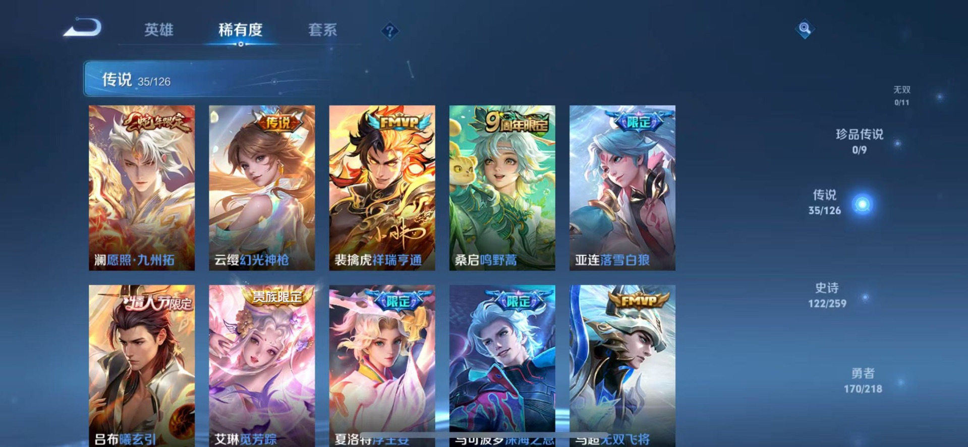 - [11547146]V7 1典藏 4传说 122英雄 203皮肤 可修改实名 优质装备:鸣剑·曳影,末日机甲-孙尚香(绿蚂蚱),地狱火,惊梅引 传说皮:幻光神枪 珍宝阁皮:优雅恋人,蔷薇恋人 限定皮:至尊宝,瑞麟志(木兰年限),高山流水,五谷丰年,梁祝,天狼绘梦者,李小龙,逐梦之影,猪悟能 史诗皮:黄金分割率,千年之狐,电玩·爆裂旋风,江河有灵,偶像歌手,魅语,冰冠公主,猫狗日记-孙策,修罗,女仆咖啡,水果甜心,绅士熊喵,星夜王子,心灵骇客,功夫厨神,德古拉伯爵,暗隐猎兽者,舞动绿茵,纤云弄巧,缤纷独角兽,乘风破浪,逐浪之夏,水晶猎龙者,金属风暴,原初追逐者,圣诞狂欢,圣诞恋歌,鹰眼统帅,王者之锤,魅力维加斯,黎明之约,未来纪元-赵云