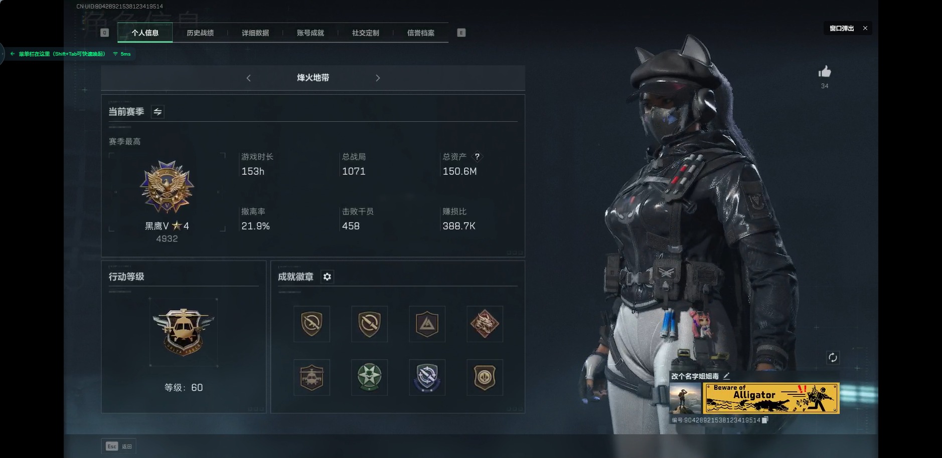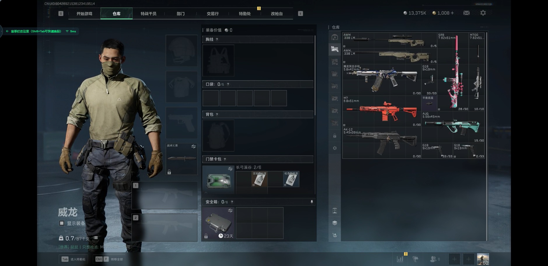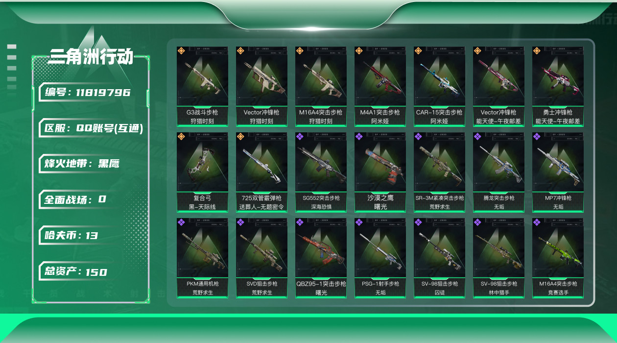 [11819796]总资产:150.6M 9传说枪械 哈夫币:13.375K 高级安全箱(2×3)9.15号到期 可二次 可修改实名 烽火地带段位:黑鹰 全面战场段位:尉官 传说武器皮肤:M16A4突击步枪-狩猎时刻,M4A1突击步枪-阿米娅,CAR-15突击步枪-阿米娅,复合弓-黑-天际线,Vector冲锋枪-狩猎时刻,G3战斗步枪-狩猎时刻,勇士冲锋枪-能天使-午夜邮差,725双管霰弹枪-送葬人-无题密令,Vector冲锋枪-能天使-午夜邮差 史诗武器皮肤:PKM通用机枪-蝮蛇,M16A4突击步枪-竞赛选手,PKM通用机枪-荒野求生,SG552突击步枪-深海恐惧,AKM突击步枪-林中猎手,SR-3M紧凑突击步枪-荒野求生,M1014霰弹枪-林中猎手,SV-98狙击步枪-林中猎手,PTR-32突击步枪-英雄,SVD狙击步枪-荒野求生,SV-98狙击步枪-囚徒,腾龙突击步枪-无垢,MP7冲锋枪-无垢,PSG-1射手步枪-无垢,QBZ95-1突击步枪-曙光,沙漠之鹰-曙光,Vector冲锋枪-阿萨拉文明