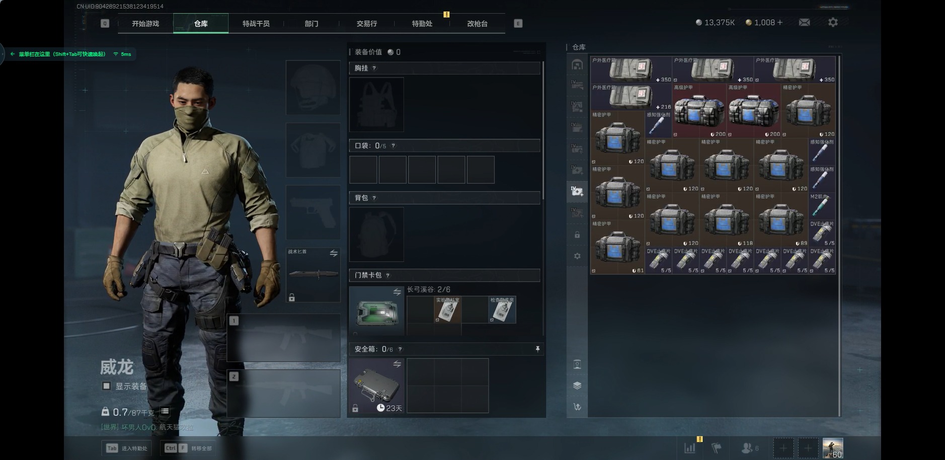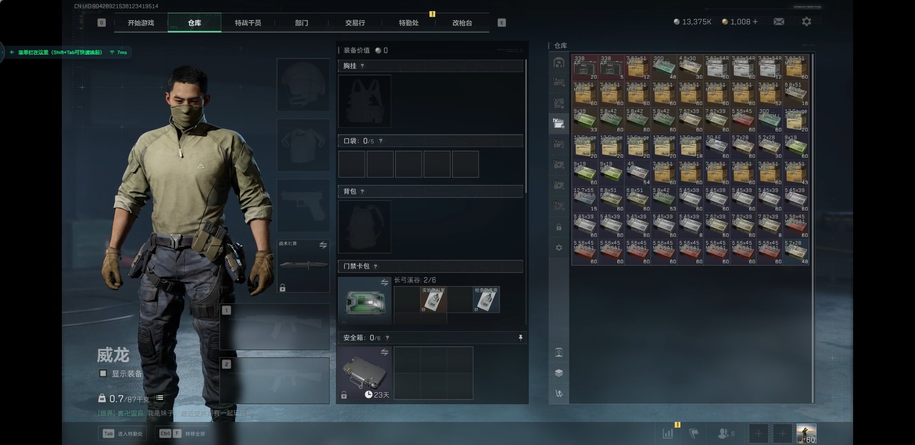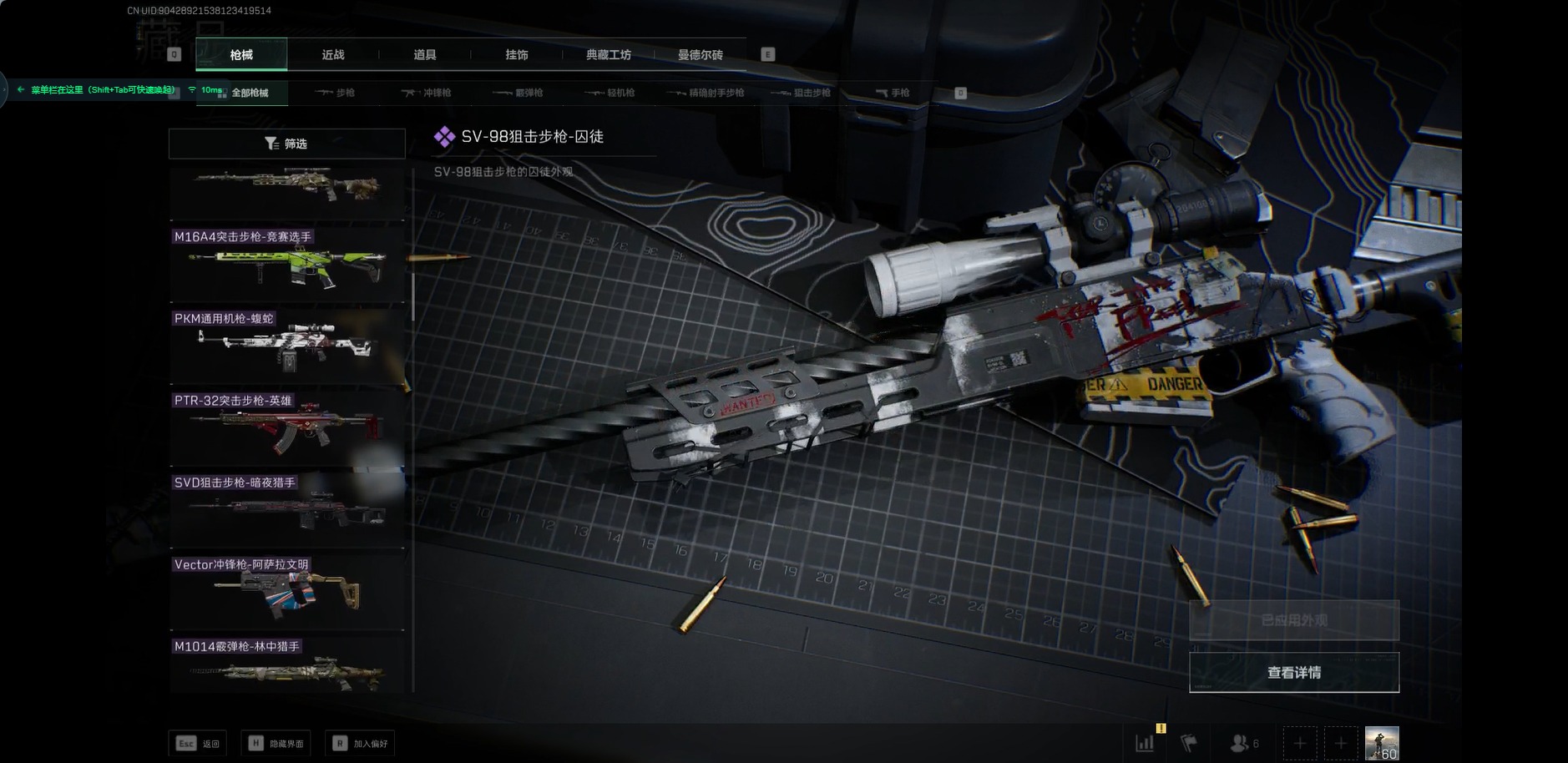 [11819796]总资产:150.6M 9传说枪械 哈夫币:13.375K 高级安全箱(2×3)9.15号到期 可二次 可修改实名 烽火地带段位:黑鹰 全面战场段位:尉官 传说武器皮肤:M16A4突击步枪-狩猎时刻,M4A1突击步枪-阿米娅,CAR-15突击步枪-阿米娅,复合弓-黑-天际线,Vector冲锋枪-狩猎时刻,G3战斗步枪-狩猎时刻,勇士冲锋枪-能天使-午夜邮差,725双管霰弹枪-送葬人-无题密令,Vector冲锋枪-能天使-午夜邮差 史诗武器皮肤:PKM通用机枪-蝮蛇,M16A4突击步枪-竞赛选手,PKM通用机枪-荒野求生,SG552突击步枪-深海恐惧,AKM突击步枪-林中猎手,SR-3M紧凑突击步枪-荒野求生,M1014霰弹枪-林中猎手,SV-98狙击步枪-林中猎手,PTR-32突击步枪-英雄,SVD狙击步枪-荒野求生,SV-98狙击步枪-囚徒,腾龙突击步枪-无垢,MP7冲锋枪-无垢,PSG-1射手步枪-无垢,QBZ95-1突击步枪-曙光,沙漠之鹰-曙光,Vector冲锋枪-阿萨拉文明