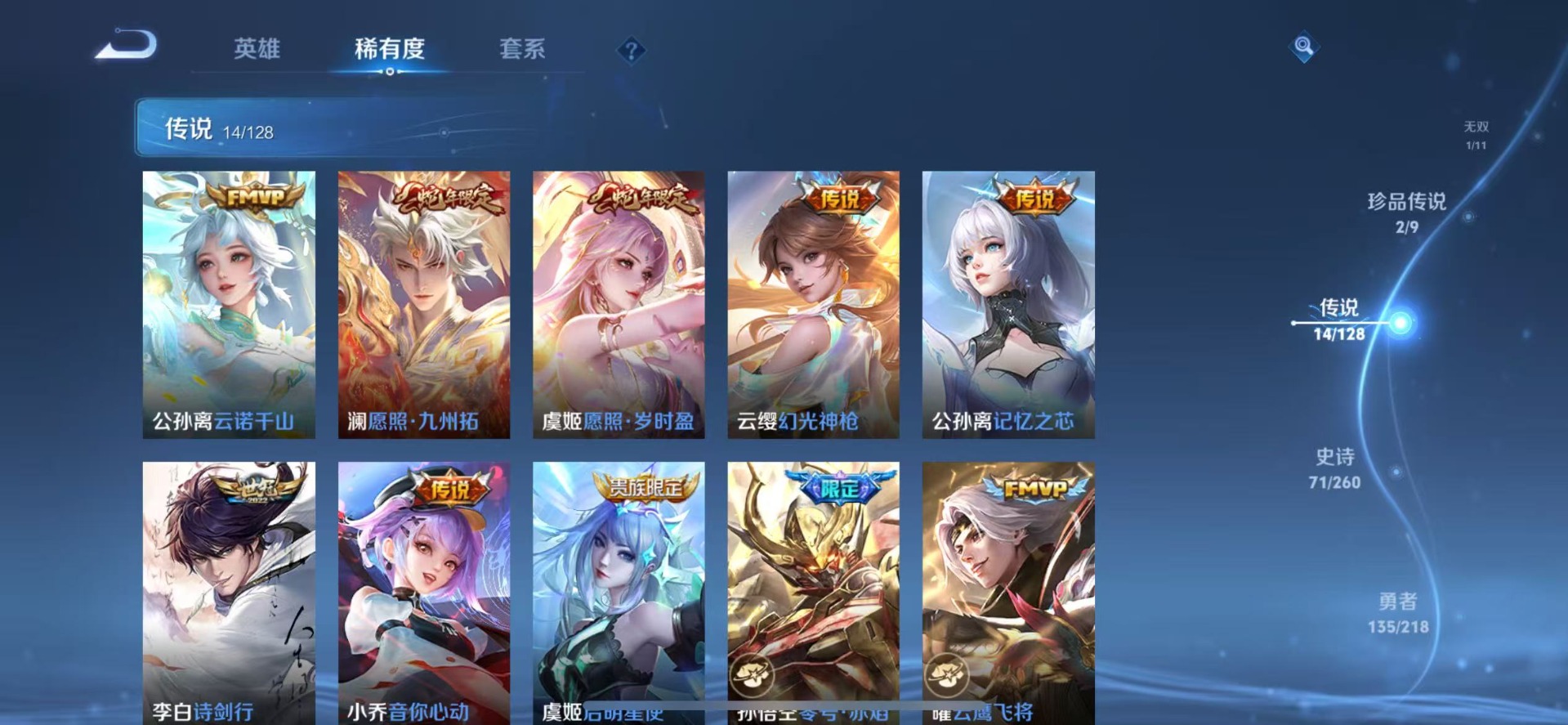 大乔白鹤梁神女,伽罗天狼溯光者,裴擒虎李小龙,上官婉儿梁祝,李白诗剑行,猪八戒猪悟能,孙悟空大圣娶亲,孙悟空至尊宝,百里玄策白虎志,百里守约朱雀志,澜愿照·九州拓,虞姬愿照·岁时盈,王昭君凤凰于飞