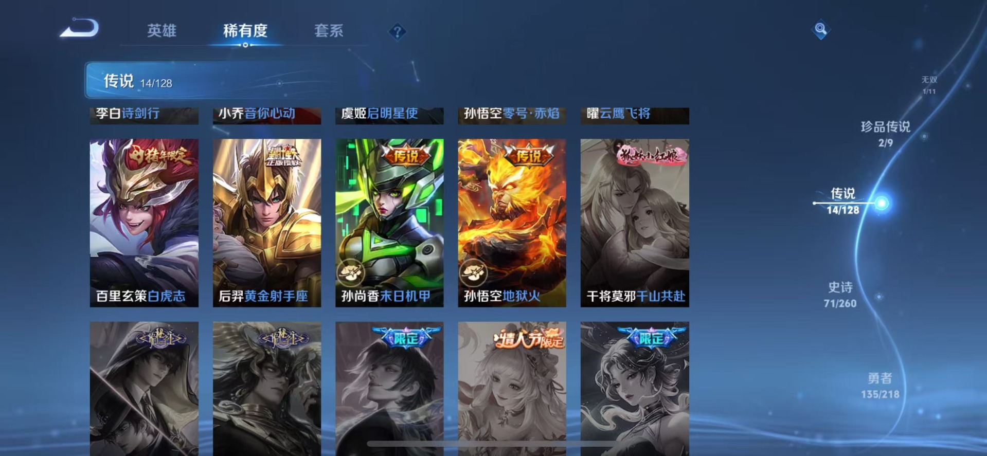 - PX_2093906-实名: 可修改 贵族等级: V5 英雄数: 119 皮肤数: 146 星传说: 未来机甲 传说皮: 末日机甲-孙尚香,山海·苍雷引 限定皮: 遇见飞天,李小龙,梁祝,高山流水,五谷丰年,山海·玄木吟