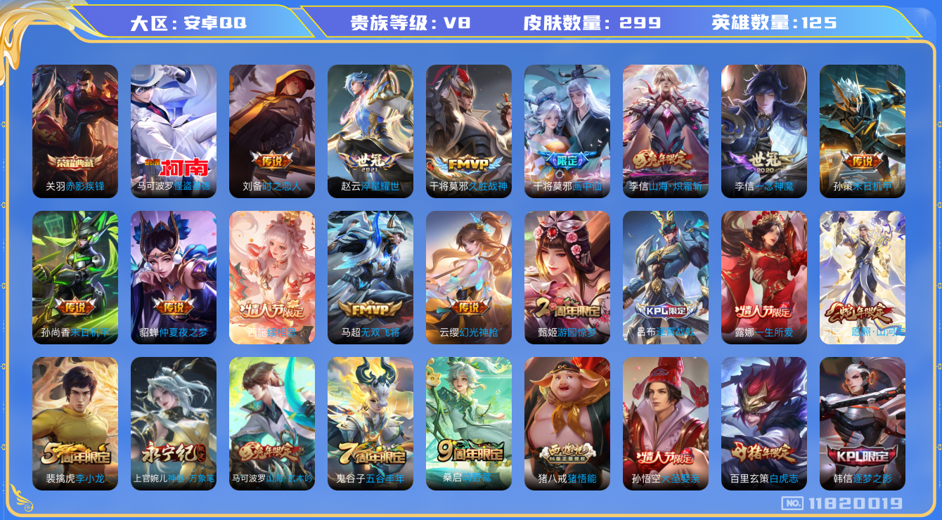 [11820019]V8 1典藏 1珍品传说 16传说 125英雄 299皮肤 可修改实名 优质装备:赤影疾锋,怪盗基德,久胜战神,一念神魔,末日机甲-孙尚香(绿蚂蚱),仲夏夜之梦(大飞蛾),时之恋人-刘备(电焊工),淬星耀世,末日机甲-孙策,无双飞将,山海·炽霜斩(李信年限),画中仙 传说皮:续相思,幻光神枪 珍宝阁皮:蔷薇恋人,女武神 限定皮:愿照·山河定(司空震年限),逐霄战戟,鸣野蒿,白虎志(电光耗子),五谷丰年,游园惊梦,李小龙,逐梦之影,猪悟能,一生所爱,大圣娶亲,神器·万象笔,山海·玄木吟(马可年限) 史诗皮:鸭鸭历险记-刘禅,绮世丹青,化蝶舞,星界战将,谪仙醉月,龙之律动,石田雨龙,茶境仙,怒海争锋,破空之剑,战舞者,蒙犽顽岩魄,蔬乡物语(鲁班七号),百相守梦-百里守约,星界特工,紫霞仙子,苍穹之光,电玩小子(小书包),白龙吟,黄金分割率,特工魅影,千年之狐,江河有灵,魅语,百解令(蒙犽),高渐离燃音魔法,蒙恬荣光圣徽,无限星赏官,冰冠公主,偶像歌手,龙骑士(小龙虾),末日机甲-吕布,猫狗日记-孙策,乱世虎臣,节奏热浪,修罗,女仆咖啡,摇滚巨星,水果甜心,天才门将,星夜王子,心灵骇客,功夫厨神,德古拉伯爵,暗隐猎兽者,幽灵船长,鬼剑武藏,心灵战警,天秀·启明,舞动绿茵,地狱岩魂,纤云弄巧,缤纷独角兽,乘风破浪,逐浪之夏,月团寄思,水晶猎龙者,曙光守护者,箭羽风息,唤灵魅影,金属风暴,原初追逐者,圣诞狂欢,圣诞恋歌,鹰眼统帅,魅力维加斯,无心,未来纪元-赵云