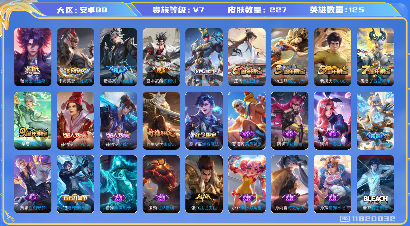[11820032]V7 5传说 125英雄 227皮肤 可修改实名 优质装备:久胜战神,鹤羽星尊,惊梅引 传说皮:铠冥王哈迪斯 珍宝阁皮:万物之道,优雅恋人,女武神 限定皮:逐霄战戟,鸣野蒿,至尊宝,遇见飞天,高山流水,五谷丰年,李小龙,朱雀志(守约年限),大圣娶亲 史诗皮:星界战将,谪仙醉月,雪豹·霜爪,藏狐·褐绒,石田雨龙,百相守梦-百里守约,星界特工,百相守梦-黄忠,紫霞仙子,苍穹之光,特工魅影,江河有灵,高渐离燃音魔法,蒙恬荣光圣徽,冰冠公主,偶像歌手,电玩·爆裂旋风,暗夜猫娘,末日机甲-吕布,猫狗日记-孙策,时之恋人-孙尚香,乱世虎臣,节奏热浪,女仆咖啡,摇滚巨星,水果甜心,绅士熊喵,天才门将,星夜王子,功夫厨神,暗隐猎兽者,幽灵船长,鬼剑武藏,心灵战警,乐园奇幻夜,天秀·启明,舞动绿茵,地狱岩魂,纤云弄巧,繁星吟游(呼啦呼啦),缤纷独角兽,乘风破浪,水晶猎龙者,曙光守护者,金属风暴,原初追逐者,圣诞恋歌,鹰眼统帅,魅力维加斯,黎明之约