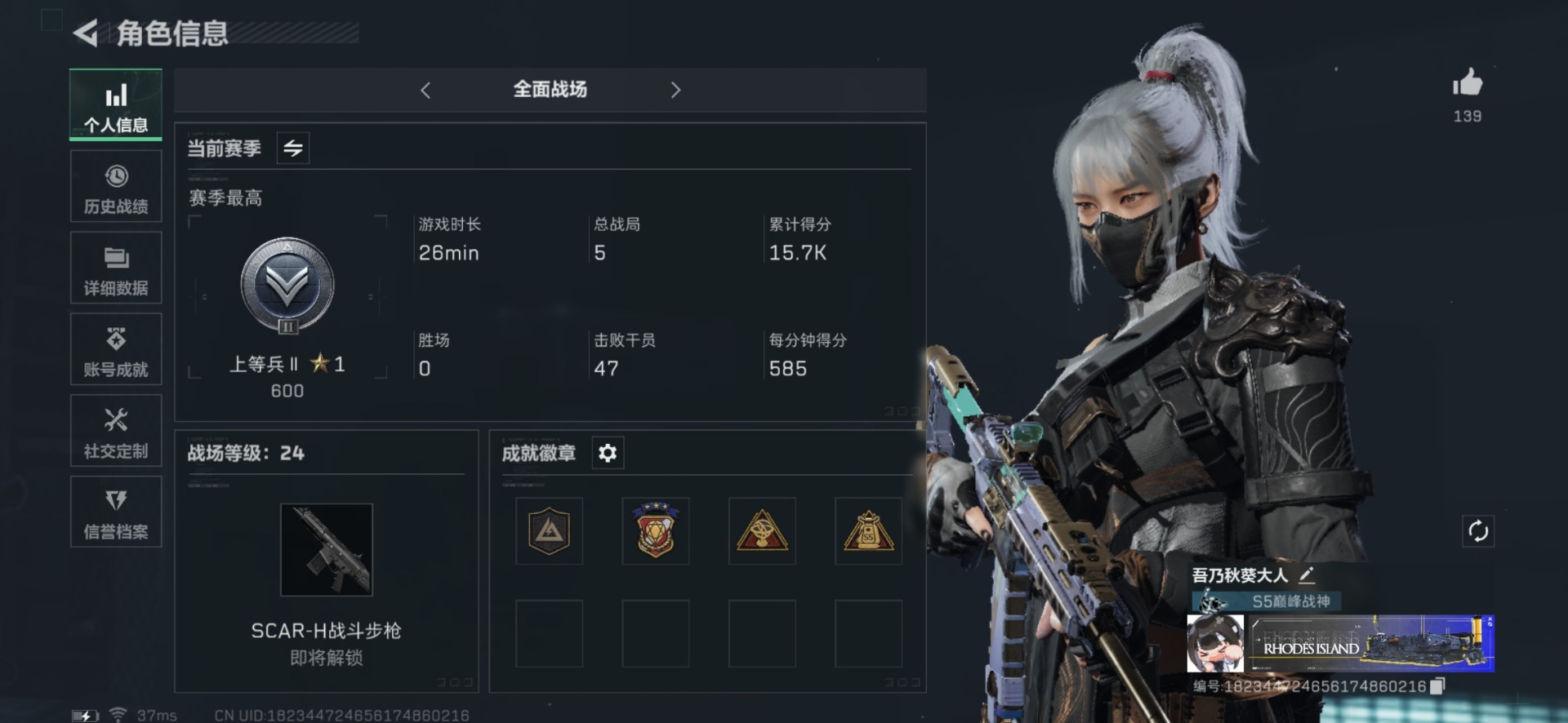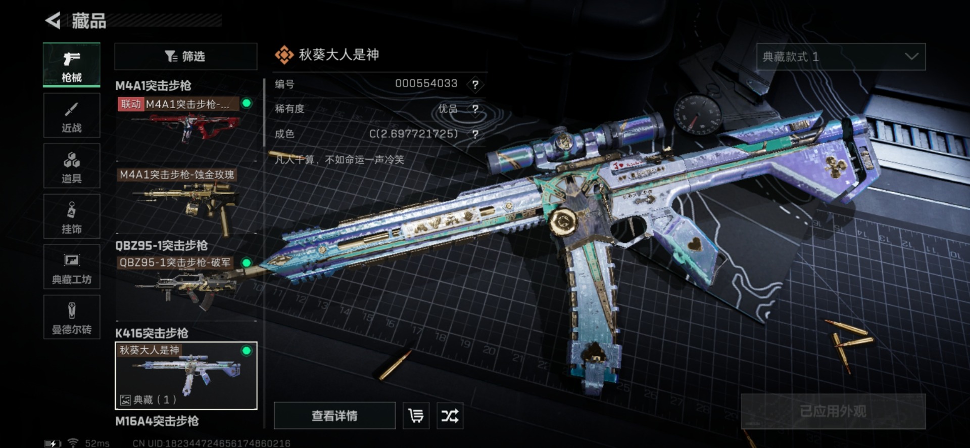 [11820034]总资产:104.1M 3干员外观 2近战传说 30传说枪械 哈夫币:3.692K 顶级安全箱(3×3)9.15号到期 可二次 可修改实名 优质装备:近战-影锋,近战-北极星,K416突击步枪-命运(典藏),SCAR-H战斗步枪-电玩高手,顶级安全箱(3x3) 烽火地带段位:三角洲巅峰 全面战场段位:上等兵 传说武器皮肤:腾龙突击步枪-蛟龙特战队,SR-25射手步枪-水墨云图,SCAR-H战斗步枪-水墨云图,AWM狙击步枪-影锋,M1014霰弹枪-影锋,SCAR-H战斗步枪-铁艺苍穹,AK-12突击步枪-夜鹰,SMG45冲锋枪-骑士,Vector冲锋枪-狩猎时刻,G3战斗步枪-狩猎时刻,M16A4突击步枪-狩猎时刻,AK-12突击步枪-特斯拉线圈,CAR-15突击步枪-阿米娅,SR-3M紧凑突击步枪-特斯拉线圈,UZI冲锋枪-特斯拉线圈,勇士冲锋枪-能天使-午夜邮差,复合弓-黑-天际线,M4A1突击步枪-阿米娅,725双管霰弹枪-送葬人-无题密令,K437突击步枪-北极星,QCQ171冲锋枪-北极星,P90冲锋枪-神秘艺术,M7战斗步枪-神秘艺术,M7战斗步枪-维京,M4A1突击步枪-蚀金玫瑰,QBZ95-1突击步枪-破军 干员外观:红狼-蚀金玫瑰,骇爪-水墨云图,露娜-黑·天际线