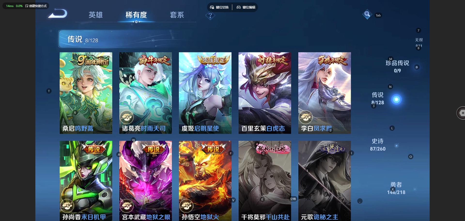 - [11472229]V8 2典藏 6传说 125英雄 225皮肤 典藏英雄武则天 可修改实名 荣耀水晶:杀手不太冷,无限飓风号(高达) 传说皮:地狱之眼,冠军飞将 限定皮:逐霄战戟,鸣野蒿,至尊宝,游园惊梦,逐梦之星,朱雀志(守约年限),永曜之星,辉光之辰,霸王别姬-项羽,霸王别姬-虞姬,天魔缭乱,青春决赛季,寅虎·心曲(虎婆) 史诗皮:龙之律动,化蝶舞,破空之剑,紫霞仙子,白龙吟,黄金分割率,特工魅影,千年之狐,百解令(蒙犽),冰冠公主,暗夜猫娘,龙骑士(小龙虾),猫狗日记-孙策,乱世虎臣,修罗,女仆咖啡,水果甜心,绅士熊喵,星夜王子,心灵骇客,暗隐猎兽者,幽灵船长,鬼剑武藏,舞动绿茵,纤云弄巧,拒霜思,缤纷独角兽,乘风破浪,水晶猎龙者,曙光守护者,圣诞狂欢,圣诞恋歌,鹰眼统帅,暗夜贵公子,未来纪元-赵云