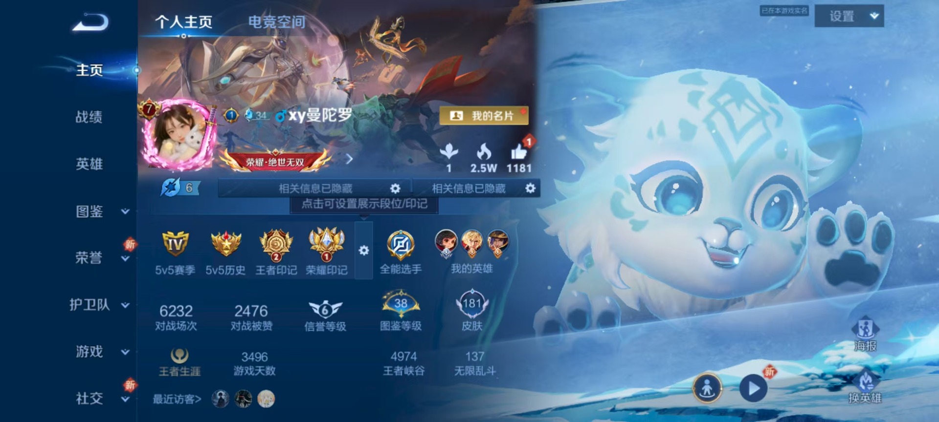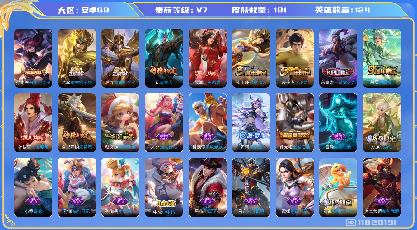 [11820191]V7 1典藏 3传说 124英雄 181皮肤 可修改实名 优质装备:杀手不太冷,黄金狮子座,黄金射手座 限定皮:鸣野蒿,遇见飞天,青龙志(铠年限),李小龙,逐梦之光,朱雀志(守约年限),奇迹圣诞,一生所爱,大圣娶亲 史诗皮:鸭鸭历险记-刘禅,化蝶舞,龙之律动,雪豹·霜爪,小牛鸭,茶境仙,紫霞仙子,冰冠公主,青蛇,偶像歌手,末日机甲-吕布,猫狗日记-孙策,猫狗日记-大乔,摇滚巨星,水果甜心,心灵骇客,幽灵船长,鬼剑武藏,心灵战警,纤云弄巧,乘风破浪,逐浪之夏,圣诞狂欢,圣诞恋歌,鹰眼统帅,王者之锤,暗夜贵公子,魅力维加斯