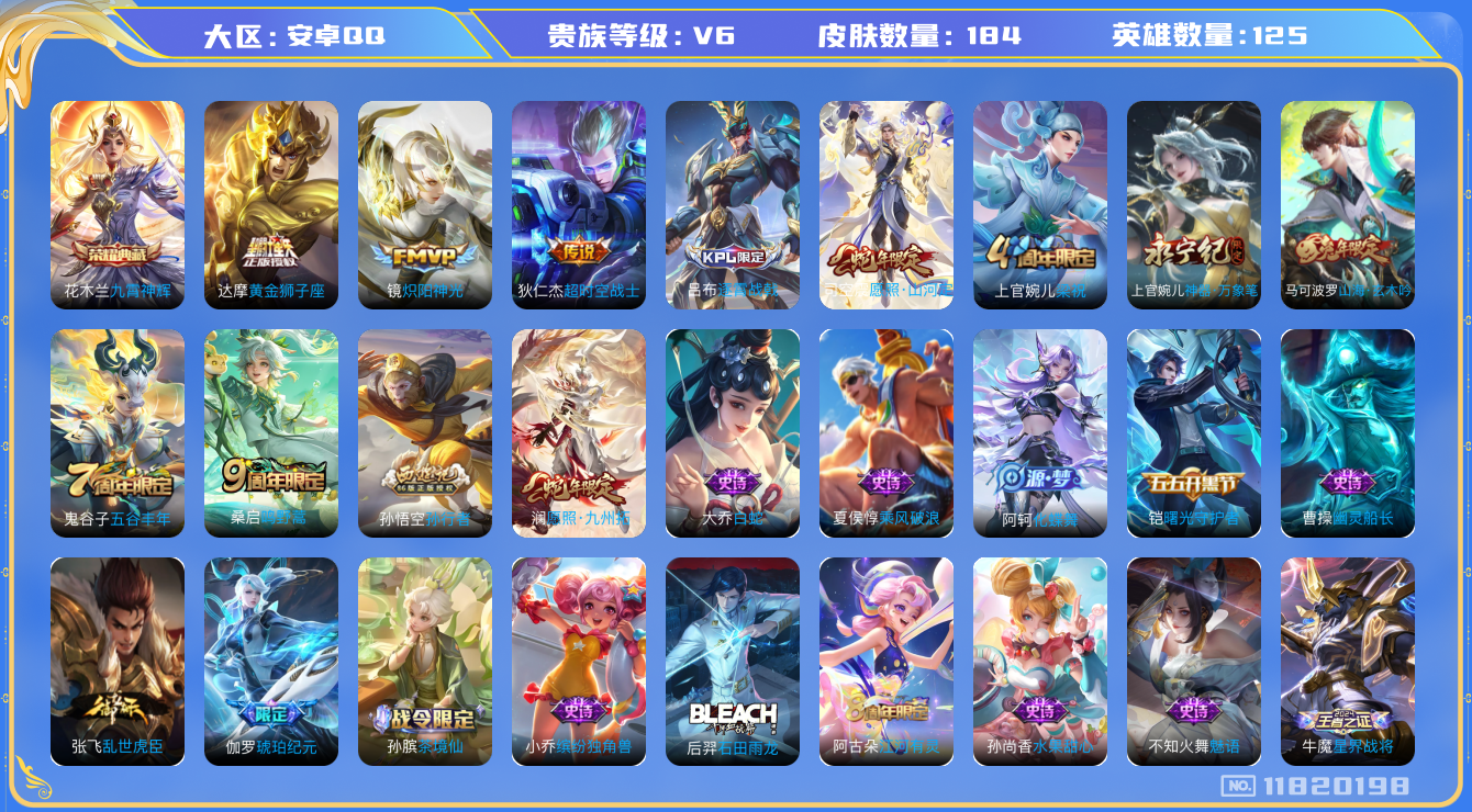 [11820198]V6 1典藏 6传说 125英雄 184皮肤 可修改实名 女号 优质装备:九霄神辉(木兰典藏),黄金狮子座,炽阳神光,超时空战士-狄仁杰,涂山容容 珍宝阁皮:蔷薇恋人,玩趣恶龙 限定皮:愿照·九州拓(澜年限),愿照·山河定(司空震年限),逐霄战戟,鸣野蒿,五谷丰年,梁祝,孙行者,神器·万象笔,山海·玄木吟(马可年限) 史诗皮:器灵·浮梦炉,化蝶舞,星界战将,谪仙醉月,龙之律动,石田雨龙,茶境仙,破空之剑,琥珀纪元伽罗,蔬乡物语(鲁班七号),百相守梦-百里守约,紫霞仙子,永昼,江河有灵,魅语,百解令(蒙犽),白蛇,晚萤,电玩·爆裂旋风,末日机甲-吕布,乱世虎臣,修罗,女仆咖啡,摇滚巨星,水果甜心,星夜王子,心灵骇客,功夫厨神,暗隐猎兽者,幽灵船长,鬼剑武藏,暗渊魔法,心灵战警,乐园奇幻夜,纤云弄巧,拒霜思,缤纷独角兽,乘风破浪,逐浪之夏,水晶猎龙者,曙光守护者,金属风暴,原初追逐者,圣诞狂欢,鹰眼统帅,魅力维加斯,无心,未来纪元-赵云