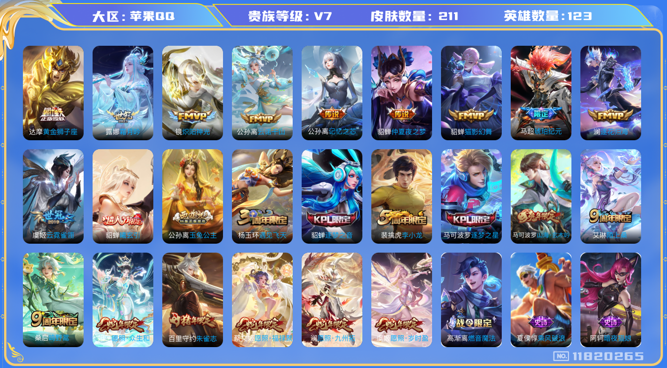 [11820265]V7 16传说 123英雄 211皮肤 可修改实名 优质装备:黄金狮子座,猫影幻舞,炽阳神光,云霓雀翎,仲夏夜之梦(大飞蛾),记忆之芯(机甲兔),霜月吟,澜逐花归海,琥珀纪元马超 传说皮:貂蝉曦玄引,云诺千山 珍宝阁皮:妄想食味,蔷薇恋人 限定皮:愿照·九州拓(澜年限),愿照·福禄聚(蔡文姬年限),愿照·岁时盈(虞姬年限),愿照·众生和(妲己年限),陌上桑,鸣野蒿,遇见飞天,逐梦之星,逐梦之音,李小龙,朱雀志(守约年限),玉兔公主,山海·玄木吟(马可年限) 史诗皮:鸭鸭历险记-刘禅,器灵·浮梦炉,绮世丹青,化蝶舞,星界战将,龙之律动,雪豹·霜爪,茶境仙,蒙犽顽岩魄,琥珀纪元伽罗,紫霞仙子,苍穹之光,电玩小子(小书包),特工魅影,江河有灵,魅语,百解令(蒙犽),高渐离燃音魔法,蒙恬荣光圣徽,无限星赏官,偶像歌手,电玩·爆裂旋风,暗夜猫娘,末日机甲-吕布,猫狗日记-孙策,时之恋人-孙尚香,乱世虎臣,节奏热浪,修罗,女仆咖啡,水果甜心,心灵骇客,鬼剑武藏,天秀·启明,地狱岩魂,繁星吟游(呼啦呼啦),缤纷独角兽,乘风破浪,逐浪之夏,水晶猎龙者,唤灵魅影,金属风暴,圣诞狂欢,圣诞恋歌,鹰眼统帅,魅力维加斯,黎明之约,未来纪元-赵云