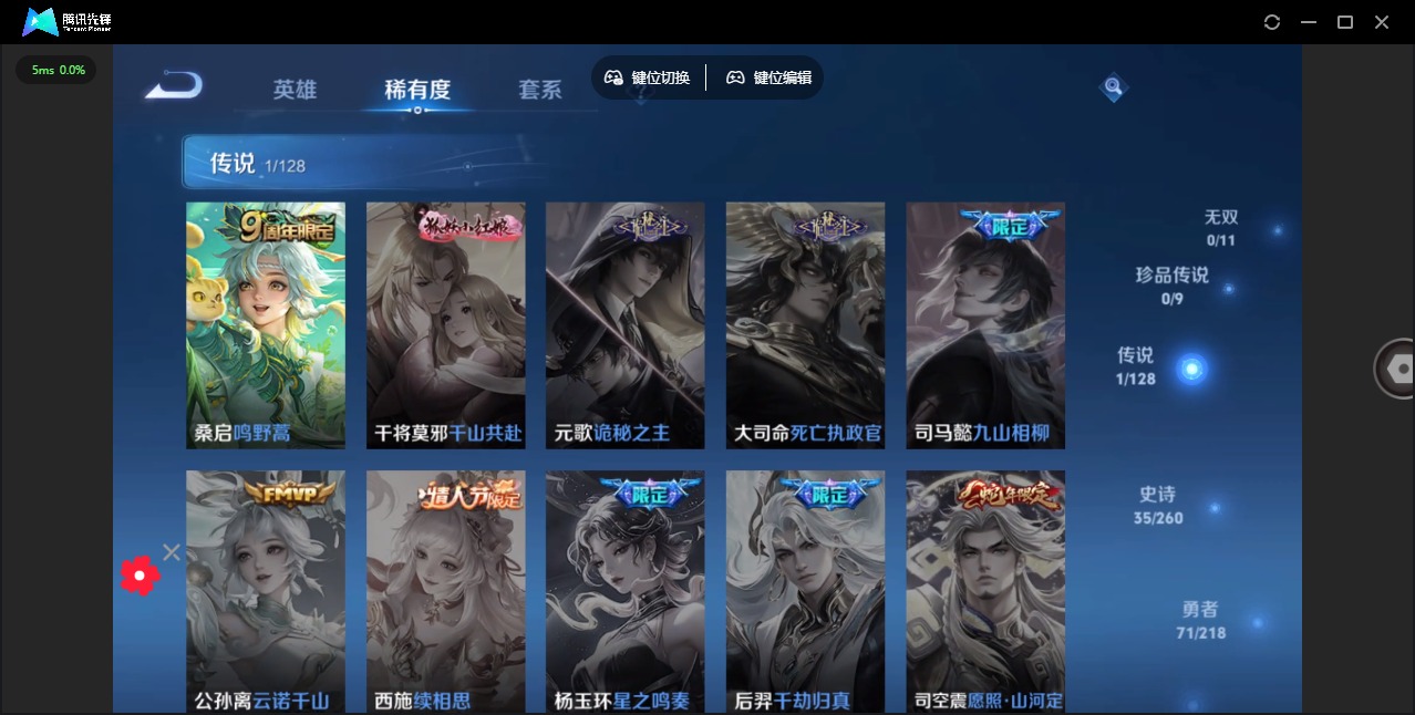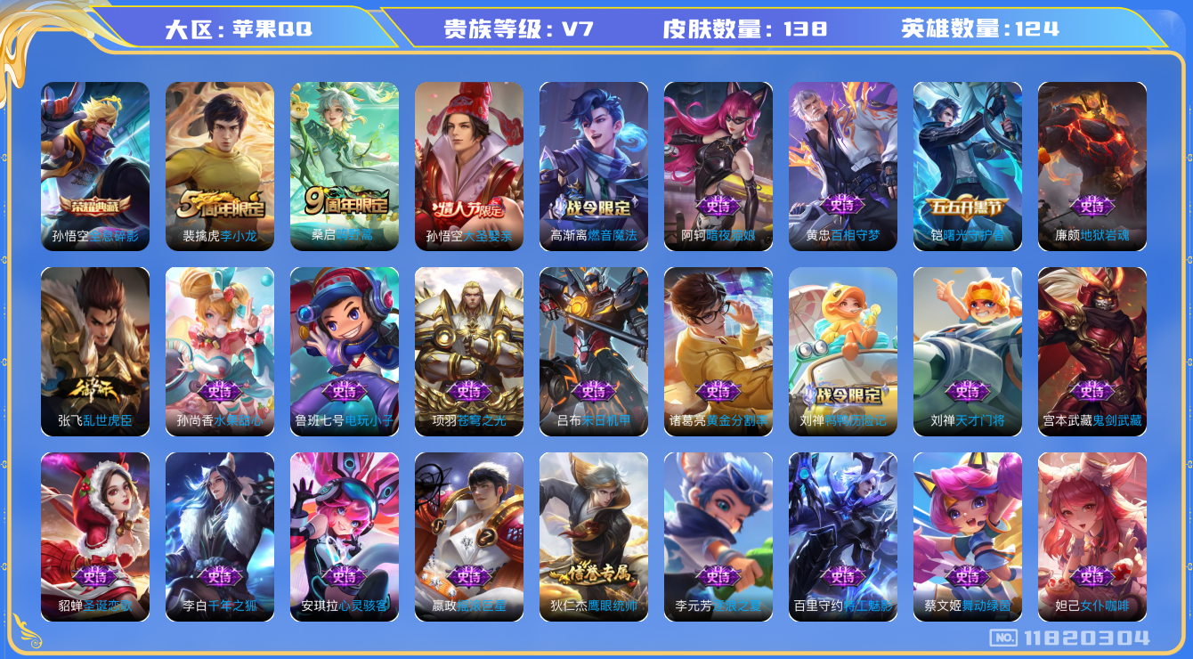 [11820304]V7 1典藏 1传说 124英雄 138皮肤 可修改实名 女号 优质装备:全息碎影(猴子典藏) 珍宝阁皮:蔷薇恋人 限定皮:鸣野蒿,李小龙,大圣娶亲 史诗皮:鸭鸭历险记-刘禅,龙之律动,百相守梦-黄忠,苍穹之光,电玩小子(小书包),黄金分割率,特工魅影,千年之狐,高渐离燃音魔法,偶像歌手,暗夜猫娘,末日机甲-吕布,乱世虎臣,女仆咖啡,摇滚巨星,水果甜心,天才门将,心灵骇客,鬼剑武藏,乐园奇幻夜,舞动绿茵,地狱岩魂,逐浪之夏,曙光守护者,圣诞恋歌,鹰眼统帅,魅力维加斯