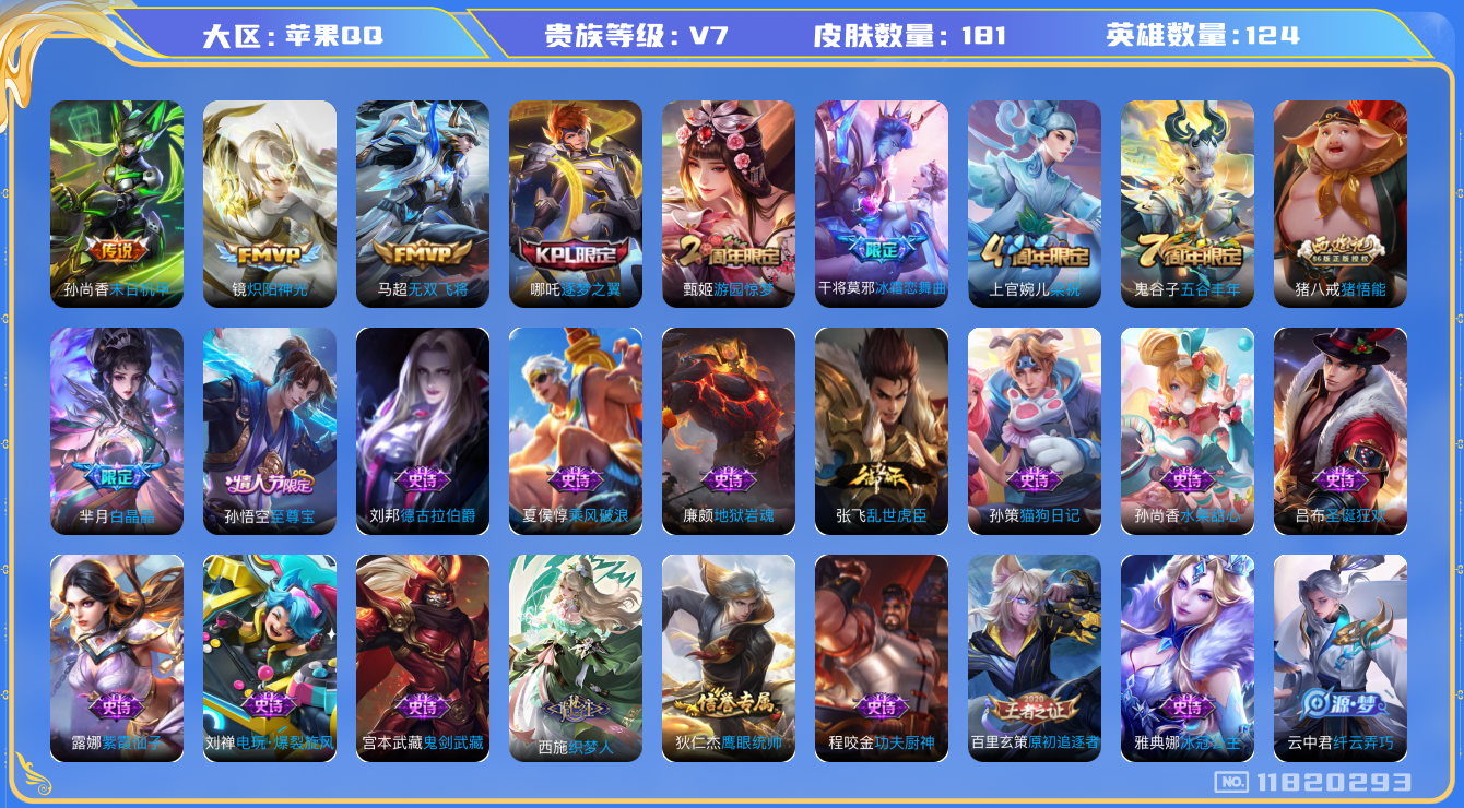 [11820293]V7 3传说 124英雄 181皮肤 可修改实名 优质装备:炽阳神光,末日机甲-孙尚香(绿蚂蚱),无双飞将 珍宝阁皮:优雅恋人 限定皮:至尊宝,白晶晶,五谷丰年,游园惊梦,梁祝,逐梦之翼,猪悟能,冰霜恋舞曲 史诗皮:龙之律动,织梦人,紫霞仙子,白龙吟,特工魅影,冰冠公主,电玩·爆裂旋风,猫狗日记-孙策,乱世虎臣,水果甜心,功夫厨神,德古拉伯爵,鬼剑武藏,地狱岩魂,纤云弄巧,拒霜思,乘风破浪,逐浪之夏,金属风暴,原初追逐者,圣诞狂欢,鹰眼统帅,魅力维加斯