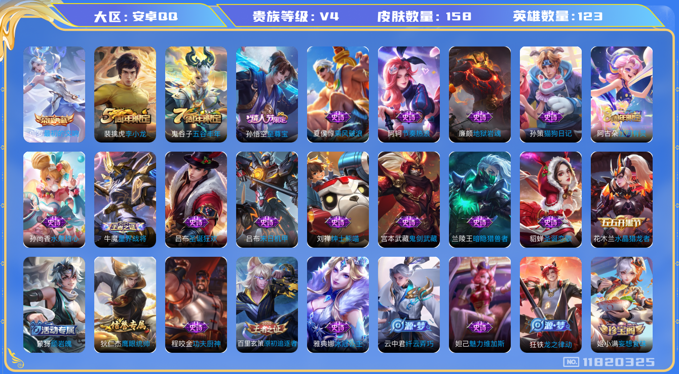 [11820325]V4 1典藏 123英雄 158皮肤 可修改实名 优质装备:最初的交响(伽罗典藏) 珍宝阁皮:妄想食味 限定皮:至尊宝,五谷丰年,李小龙 史诗皮:星界战将,龙之律动,蒙犽顽岩魄,江河有灵,冰冠公主,末日机甲-吕布,猫狗日记-孙策,节奏热浪,水果甜心,绅士熊喵,功夫厨神,暗隐猎兽者,鬼剑武藏,地狱岩魂,纤云弄巧,乘风破浪,水晶猎龙者,原初追逐者,圣诞狂欢,圣诞恋歌,鹰眼统帅,魅力维加斯