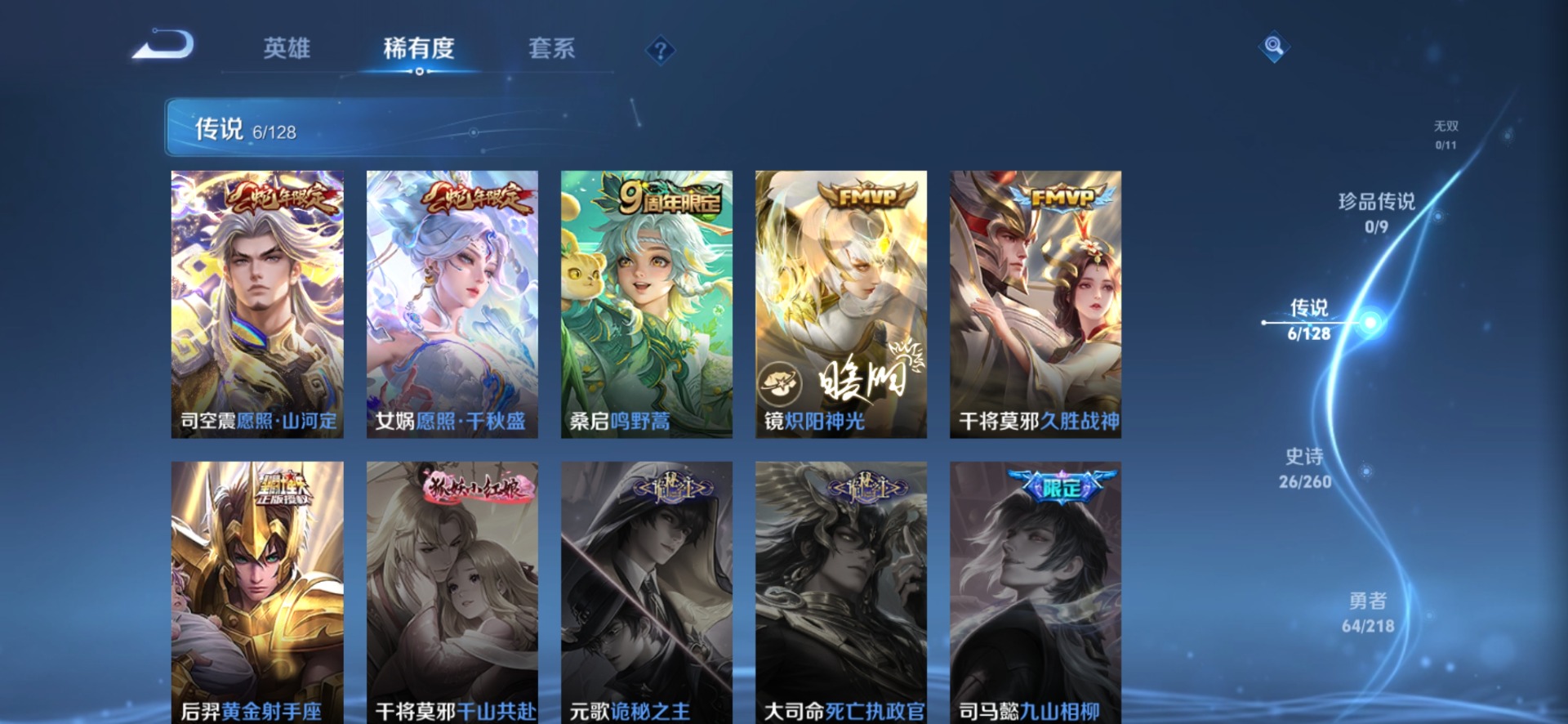 [11820330]V5 6传说 118英雄 111皮肤 可修改实名 优质装备:黄金射手座,久胜战神,炽阳神光 珍宝阁皮:妄想食味 限定皮:愿照·山河定(司空震年限),愿照·千秋盛(女娲年限),鸣野蒿,烈魂 史诗皮:器灵·浮梦炉,石田雨龙,茶境仙,蒙犽顽岩魄,偶像歌手,龙骑士(小龙虾),摇滚巨星,水果甜心,绅士熊喵,德古拉伯爵,暗隐猎兽者,幽灵船长,鬼剑武藏,乘风破浪,逐浪之夏,水晶猎龙者,曙光守护者,原初追逐者,鹰眼统帅,魅力维加斯,未来纪元-赵云