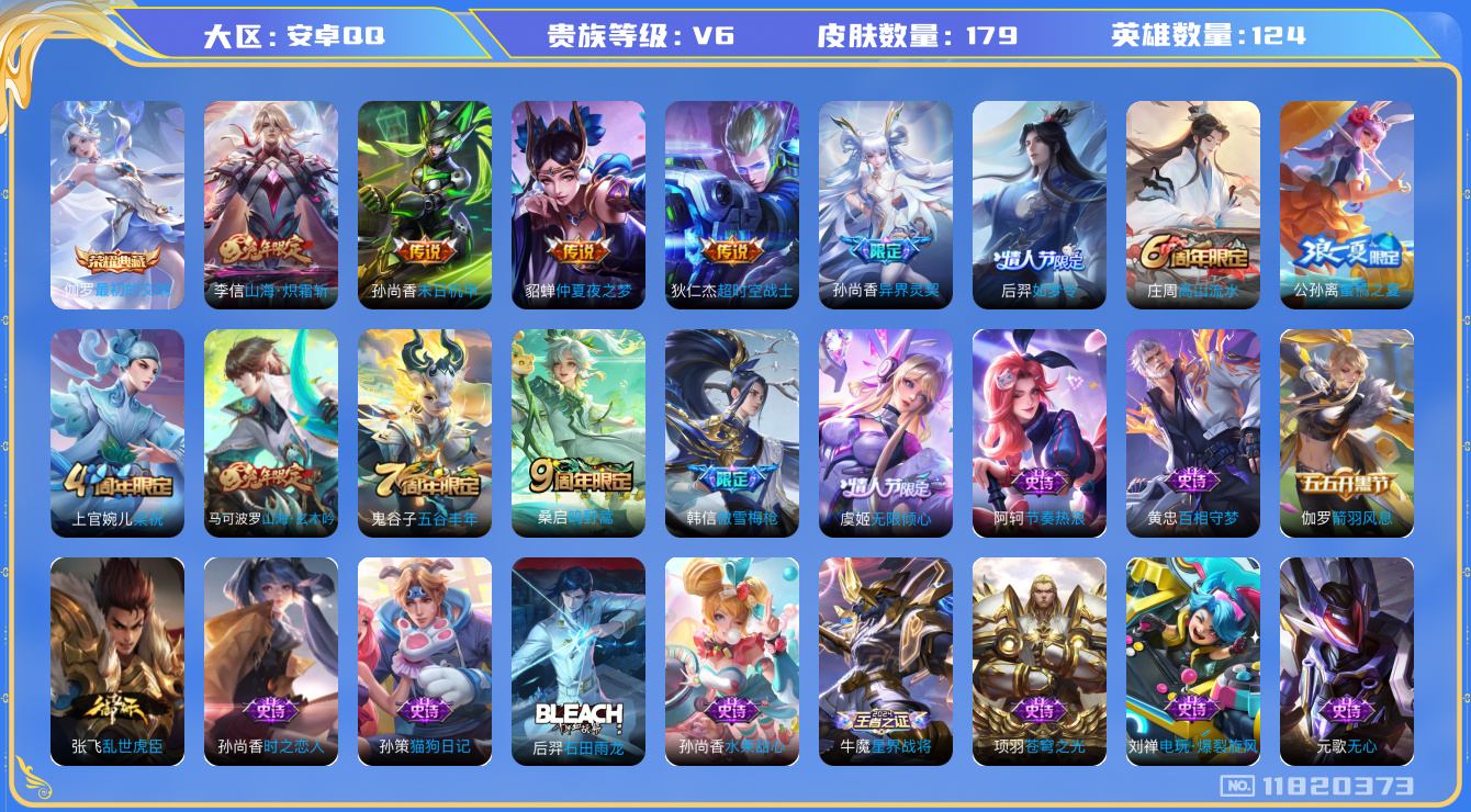 - [12114676]V6 1珍品传说 6传说 122英雄 150皮肤 可修改实名 优质装备:黑崎一护,炽阳神光,地狱之眼,澜逐花归海,琥珀纪元铠,涂山容容 传说皮:幻光神枪 珍宝阁皮:玩趣恶龙 限定皮:愿照·九州拓(澜年限),五谷丰年 史诗皮:鸭鸭历险记-刘禅,化蝶舞,星界战将,龙之律动,石田雨龙,茶境仙,琥珀纪元伽罗,蔬乡物语(鲁班七号),百相守梦-黄忠,特工魅影,高渐离燃音魔法,偶像歌手,猫狗日记-孙策,乱世虎臣,节奏热浪,女仆咖啡,摇滚巨星,水果甜心,暗隐猎兽者,幽灵船长,鬼剑武藏,地狱岩魂,逐浪之夏,水晶猎龙者,曙光守护者,原初追逐者,圣诞狂欢,圣诞恋歌,鹰眼统帅,魅力维加斯,未来纪元-赵云