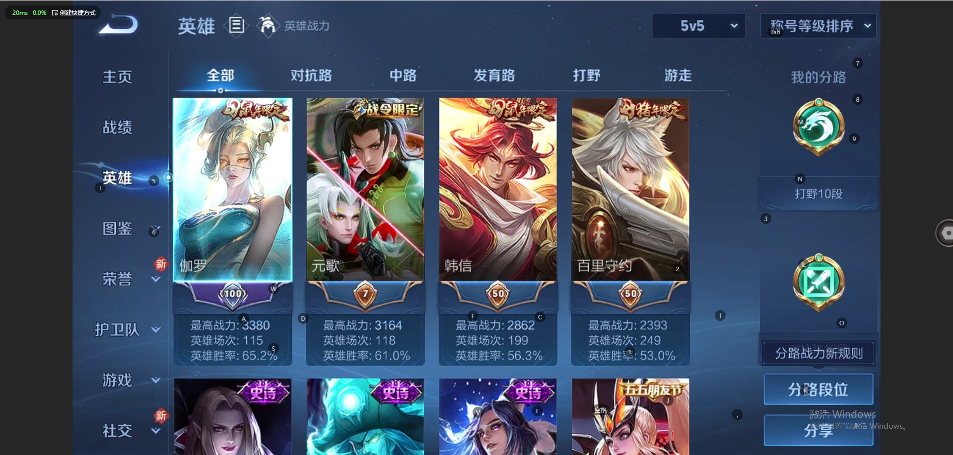 - PX_2027649-贵族等级: V7 英雄数: 123 皮肤数: 170 传说皮: 冠军飞将,仲夏夜之梦,山海·苍雷引,妄想实况,澜逐花归海,幻光神枪,祥瑞亨通 限定皮: 冰锋战神,李小龙,梁祝,烈魂,神威,飞衡,五谷丰年,神器·万象笔,山海·玄木吟,齐天大圣,鸣野蒿,逐霄战戟,愿照·千秋盛