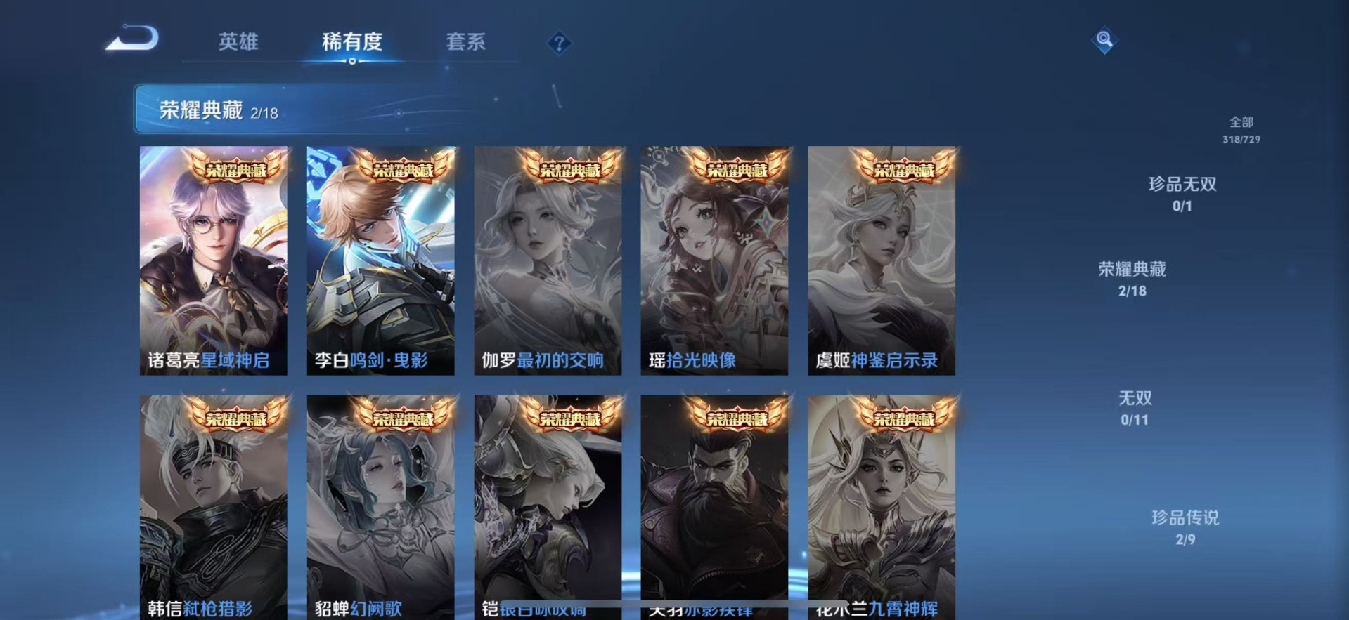 夏侯惇朔风刀,老夫子醍醐杖,沈梦溪星空之诺,沈梦溪大漠名商,曹操烛龙,苏烈千军破阵,典韦穷奇,典韦蓝屏警告,达摩沙漠行僧,牛魔御旌,项羽苍威无极,吕布猎兽之王,镜青焰无极,元歌云间偶戏,兰陵王金庭之子,裴擒虎擒涛扼浪,鲁班大师探海日志,明世隐疑决卦,蒙犽狂想玩偶喵,马可波罗暗影游猎,白起狰,鬼谷子原初探秘者,张良古海寻踪,女娲朔望之晖,桑启海盐诗旅,狄仁杰万华元夜,嬴政白昼王子,芈月重明,程咬金演武夺筹,李元芳银河之约,李元芳云中旅人,弈星混沌棋,米莱狄御霄,钟馗驱傩正仪,狂铁御狮,太乙真人饕餮