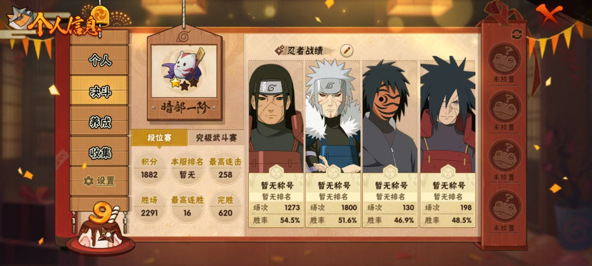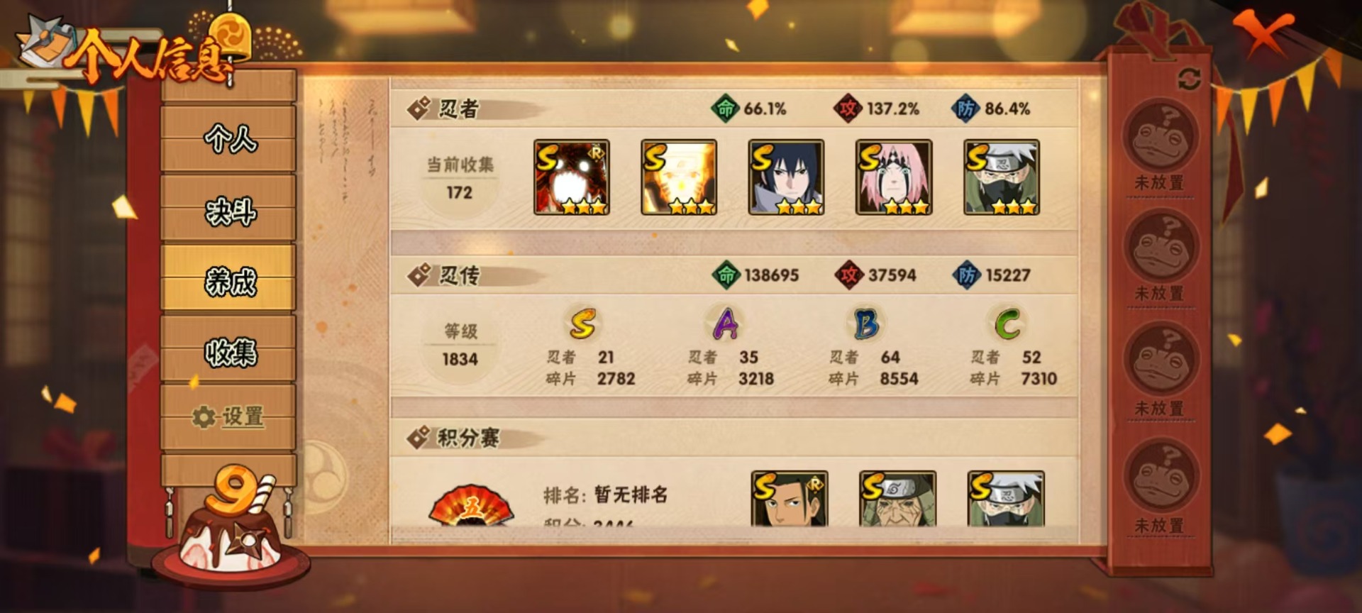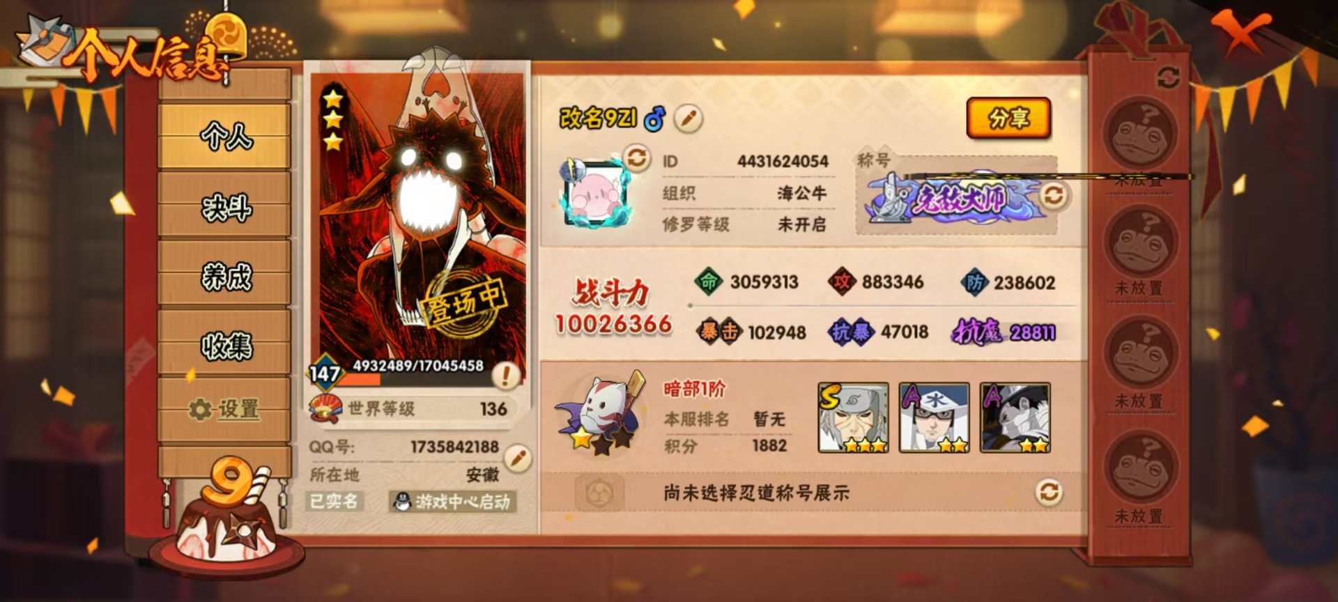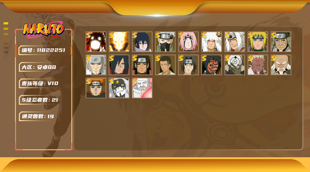 [11822251]V10 21S忍 35A忍 19通灵 1002.6W战力 可二次 可修改实名 优质装备:熊猫,千手柱间「秽土转生」,千手扉间「秽土转生」,猿飞日斩「秽土转生」,“宇智波斑” 「白面具」,漩涡鸣人 「九喇嘛连结」,大筒木金式「博人传」,春野樱 「忍界大战」,神秘面具男 「红夜之刃」,宇智波佐助「永恒万花筒」,千手柱间·木叶创立,宇智波斑「秽土转生·解」,大筒木桃式,艾「忍界大战」,旗木卡卡西「须佐能乎」,自来也 「传说中的三忍」,漩涡鸣人 「暴怒·第六尾」 S级忍者:大野木 「忍界大战」,自来也 「舞之豪杰」,宇智波鼬 「须佐能乎」,佩恩「天道」,波风水门