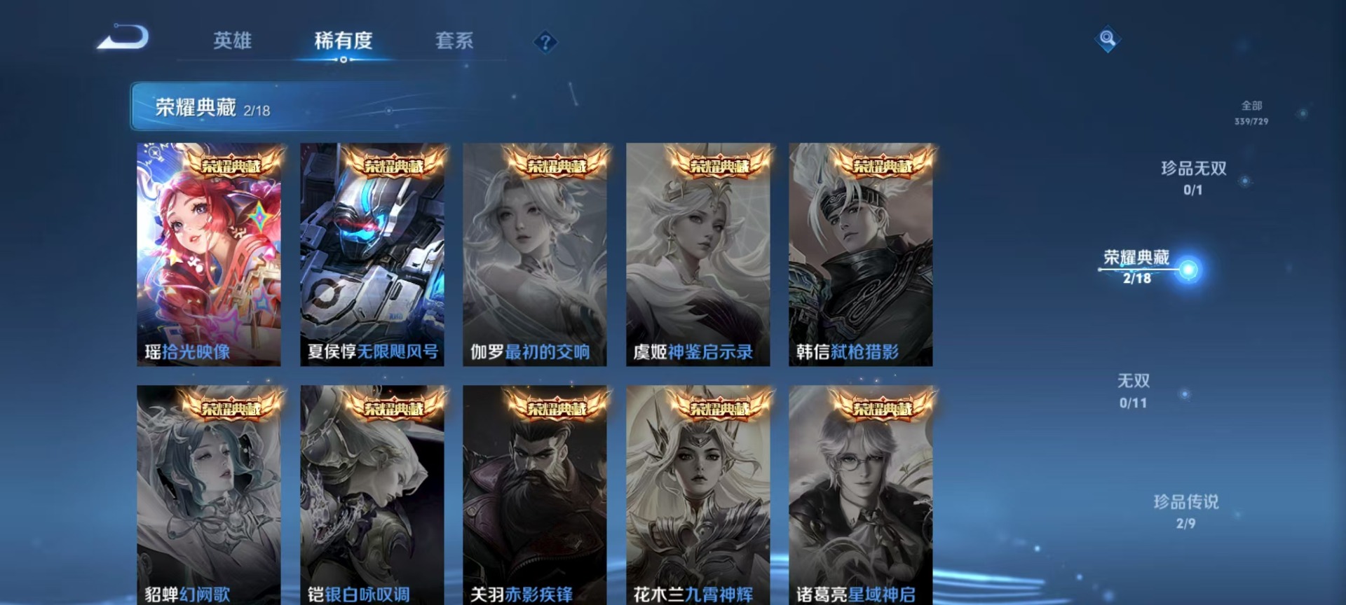 - PX_2083179-38 安卓QQ/最强王者/288皮肤/124英雄/1典藏/1珍品无双/2无双/6珍品传说/31传说/79史诗/9稀有英雄 【1 珍品无双】馥梦繁花, 【6 珍品传说】酷洛米之心 安琪拉,大耳狗之梦 瑶,朽木白哉 暃,黑崎一护 宫本武藏,器灵·落星盏 嫦娥,兔狲·蓬尾 张飞, 【1 典藏皮肤】最初的交响 伽罗, 【2 无双皮肤】时之魔女 小乔,器灵·螭龙剑 曜, 【31 传说皮