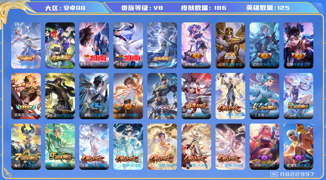 [11822997]V8 1典藏 4珍品传说 17传说 125英雄 186皮肤 可修改实名 优质装备:最初的交响(伽罗典藏),江户川柯南,怪盗基德,器灵·落星盏,黄金射手座,云霓雀翎,仲夏夜之梦(大飞蛾),海洋之心,音你闪耀(rap皮),涂山容容 珍品传说:时之奇旅-孙策 传说皮:死亡执政官,祥瑞亨通,幻光神枪 珍宝阁皮:蔷薇恋人,女武神 限定皮:愿照·九州拓(澜年限),愿照·福禄聚(蔡文姬年限),愿照·岁时盈(虞姬年限),愿照·山河定(司空震年限),愿照·众生和(妲己年限),愿照·千秋盛(女娲年限),逐霄战戟,陌上桑,鸣野蒿,五谷丰年,梁祝,祈雪灵祝(雪兔子) 史诗皮:鸭鸭历险记-刘禅,器灵·浮梦炉,化蝶舞,龙之律动,百相守梦-周瑜,茶境仙,百相守梦-百里守约,百相守梦-黄忠,紫霞仙子,魅语,冰冠公主,偶像歌手,龙骑士(小龙虾),猫狗日记-孙策,猫狗日记-大乔,节奏热浪,修罗,女仆咖啡,水果甜心,星夜王子,功夫厨神,幽灵船长,鬼剑武藏,心灵战警,天秀·启明,地狱岩魂,乘风破浪,逐浪之夏,月团寄思,鹰眼统帅