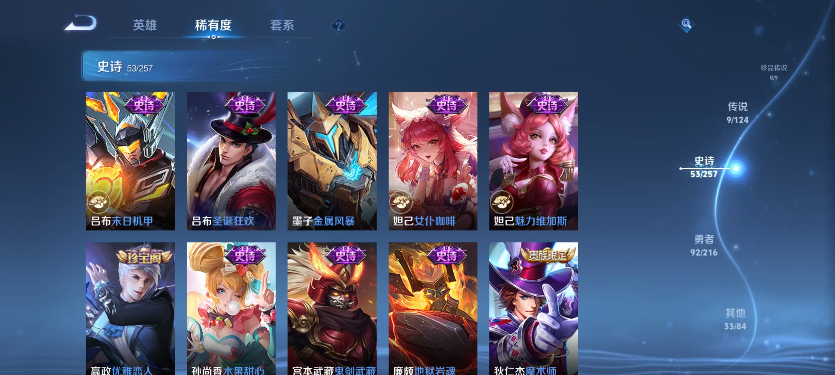 白起狰,芈月重明,典韦穷奇,盾山御銮,夏侯惇朔风刀,明世隐疑决卦,老夫子醍醐杖,鬼谷子原初探秘者,狄仁杰万华元夜,程咬金演武夺筹,钟馗驱傩正仪,苏烈千军破阵,马可波罗暗影游猎,元歌云间偶戏,弈星混沌棋,达摩沙漠行僧,兰陵王金庭之子,沈梦溪大漠名商,李元芳云中旅人,桑启海盐诗旅,裴擒虎擒涛扼浪