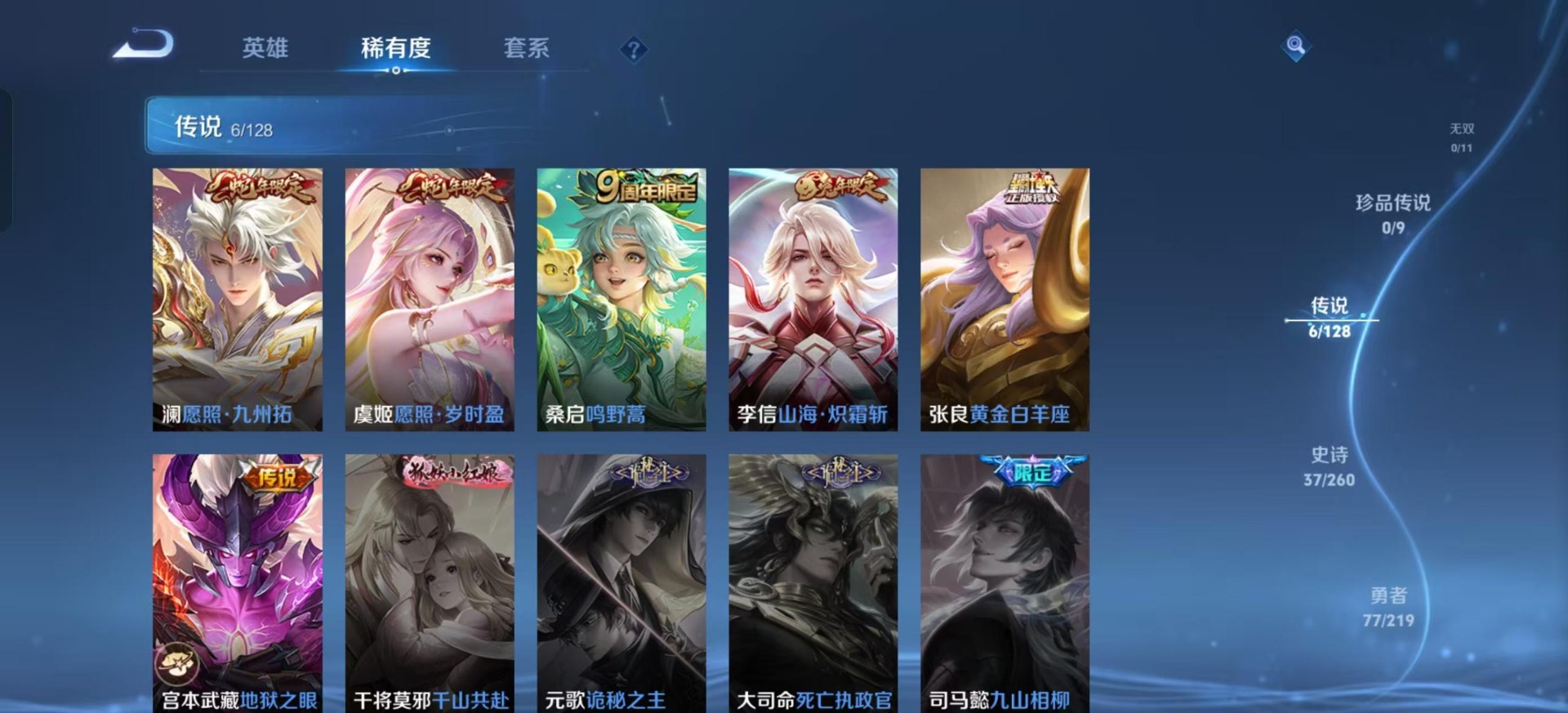 - [12075286]V7 1典藏 4传说 124英雄 147皮肤 可修改实名 优质装备:无限飓风号(高达),末日机甲-孙尚香(绿蚂蚱),超时空战士-狄仁杰 珍宝阁皮:蔷薇恋人 限定皮:白虎志(电光耗子),凤求凰(白切鸡),飞衡(韩信年限),遇见飞天,高山流水,冰锋战神,梁祝,李小龙,朱雀志(守约年限),辉光之辰 史诗皮:百相守梦-黄忠,苍穹之光,白龙吟,黄金分割率,江河有灵,冰冠公主,晚萤,末日机甲-吕布,节奏热浪,女仆咖啡,摇滚巨星,水果甜心,星夜王子,德古拉伯爵,暗隐猎兽者,鬼剑武藏,纤云弄巧,逐浪之夏,原初追逐者,圣诞狂欢,圣诞恋歌,鹰眼统帅