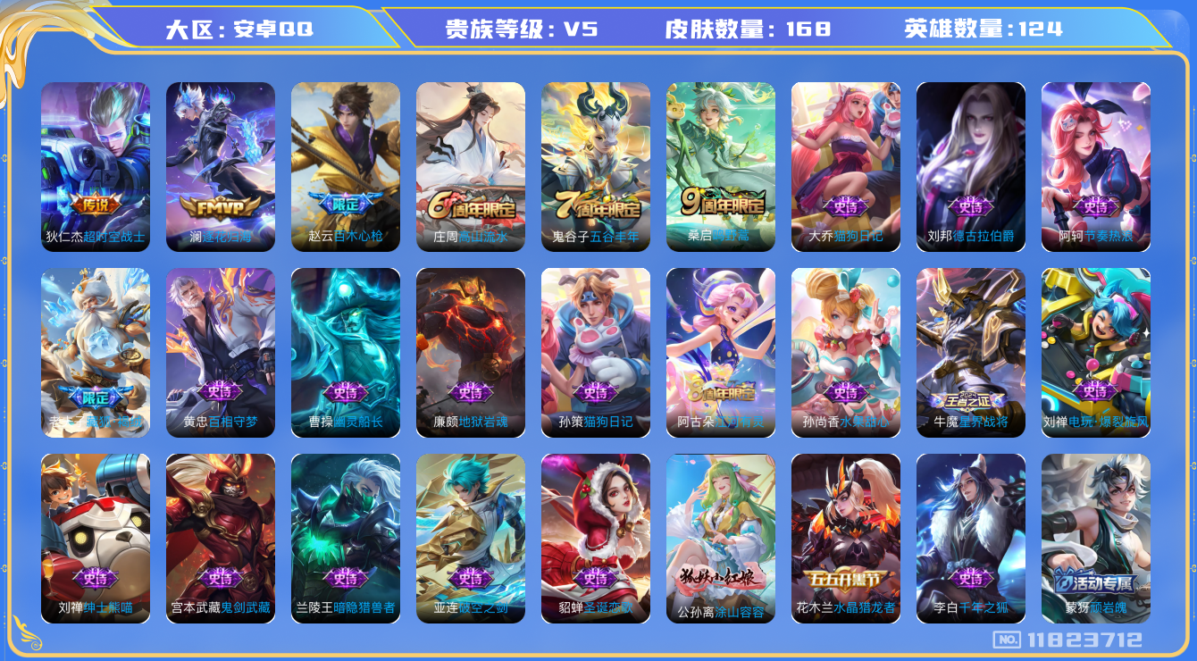 [11823712]V5 3传说 124英雄 168皮肤 可修改实名 优质装备:超时空战士-狄仁杰,澜逐花归海,涂山容容 珍宝阁皮:妄想食味,蔷薇恋人 限定皮:鸣野蒿,高山流水,五谷丰年,百木心枪 史诗皮:星界战将,龙之律动,雪豹·霜爪,藏狐·褐绒,破空之剑,蒙犽顽岩魄,百相守梦-黄忠,千年之狐,江河有灵,电玩·爆裂旋风,猫狗日记-孙策,猫狗日记-大乔,节奏热浪,修罗,女仆咖啡,水果甜心,绅士熊喵,德古拉伯爵,暗隐猎兽者,幽灵船长,鬼剑武藏,心灵战警,舞动绿茵,地狱岩魂,纤云弄巧,拒霜思,逐浪之夏,水晶猎龙者,金属风暴,原初追逐者,圣诞恋歌,鹰眼统帅