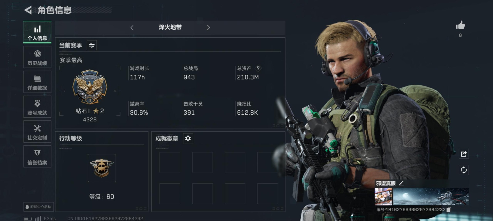 - [11554180]可二次 可修改实名 实名:可修改 烽火地带段位:钻石 全面战场段位:军士长 顶级安全箱(3×3)9.15号到期 总资产:202.2 哈夫币:1.423 传说武器皮肤:近战-影锋,近战-北极星,QBZ95-1突击步枪-王牌之剑(典藏),K416突击步枪-命运(典藏),AUG突击步枪-气象感应(典藏),AWM狙击步枪-影锋,复合弓-黑-天际线,G18-飞虎,M7战斗步枪-神秘艺术 史诗武器皮肤:QBZ95-1突击步枪-ACE,AUG突击步枪-特勤执行,AUG突击步枪-蝮蛇,M700狙击步枪-蝮蛇,M700狙击步枪-守夜人,SG552突击步枪-尖端治疗,Ash-12战斗步枪-守夜人,M16A4突击步枪-竞赛选手,QBZ95-1突击步枪-曙光,沙漠之鹰-曙光,M700狙击步枪-竞技风,93R-博士 干员外观:红狼-蚀金玫瑰,骇爪-水墨云图,威龙-飞虎,露娜-黑·天际线